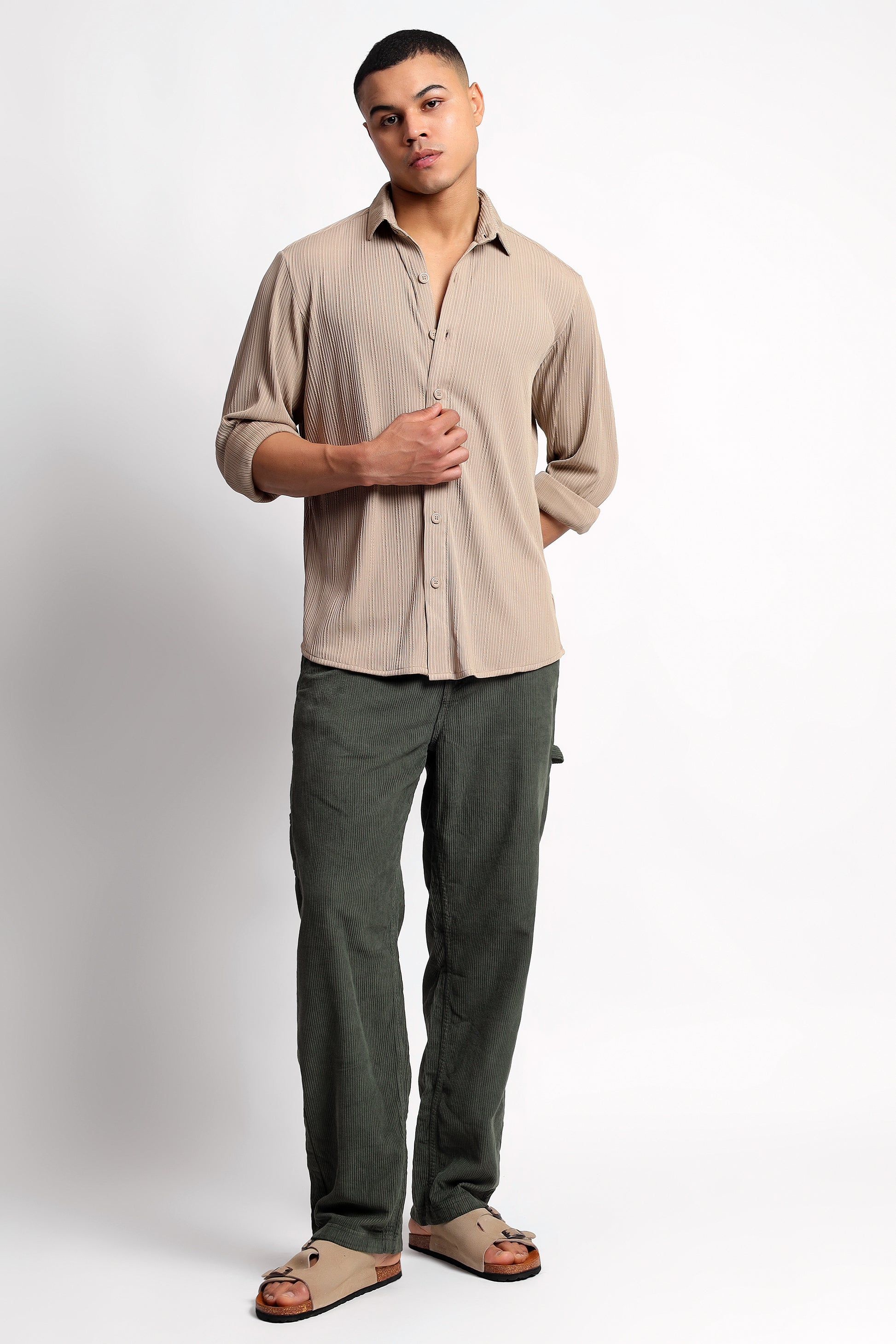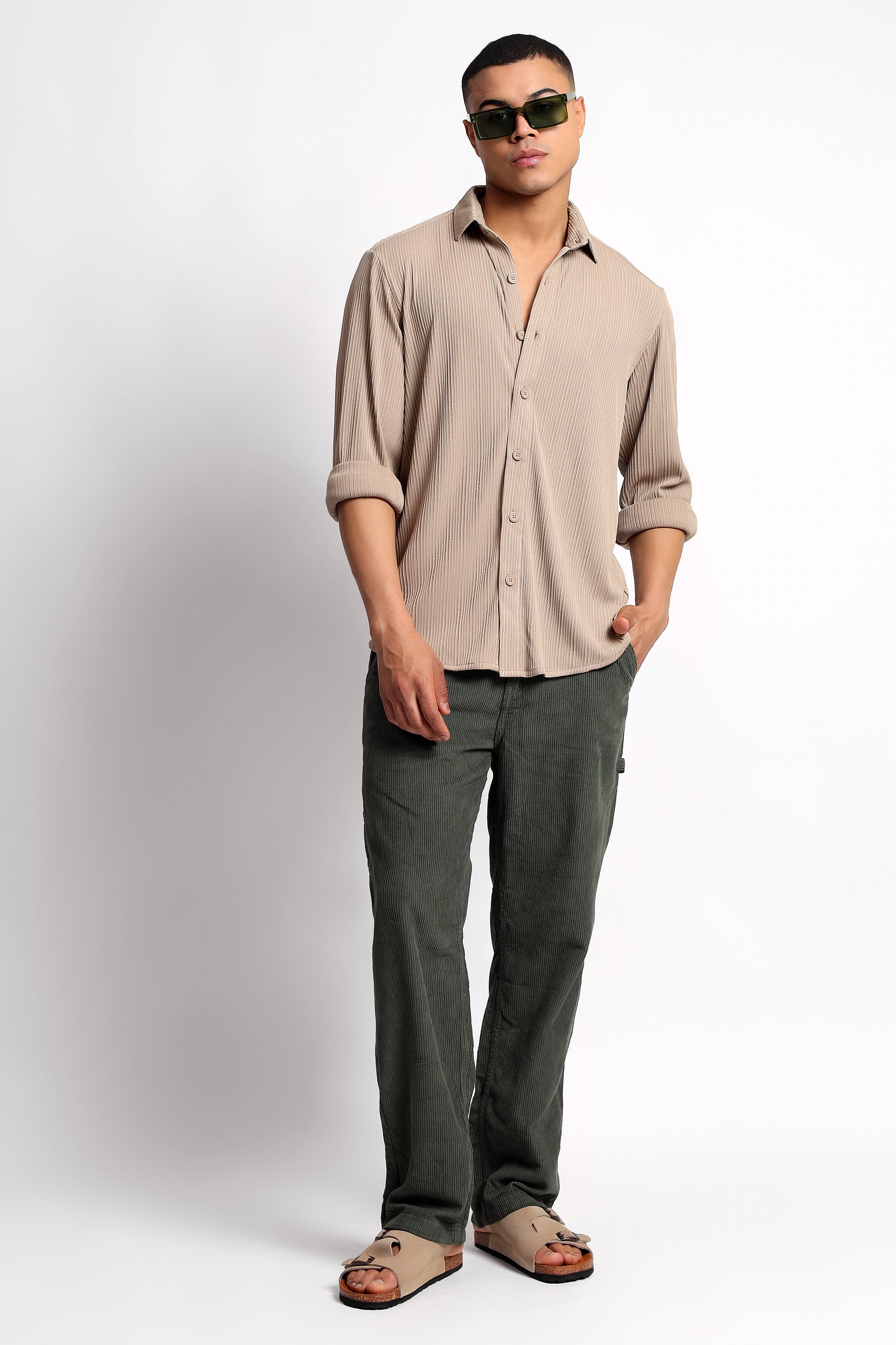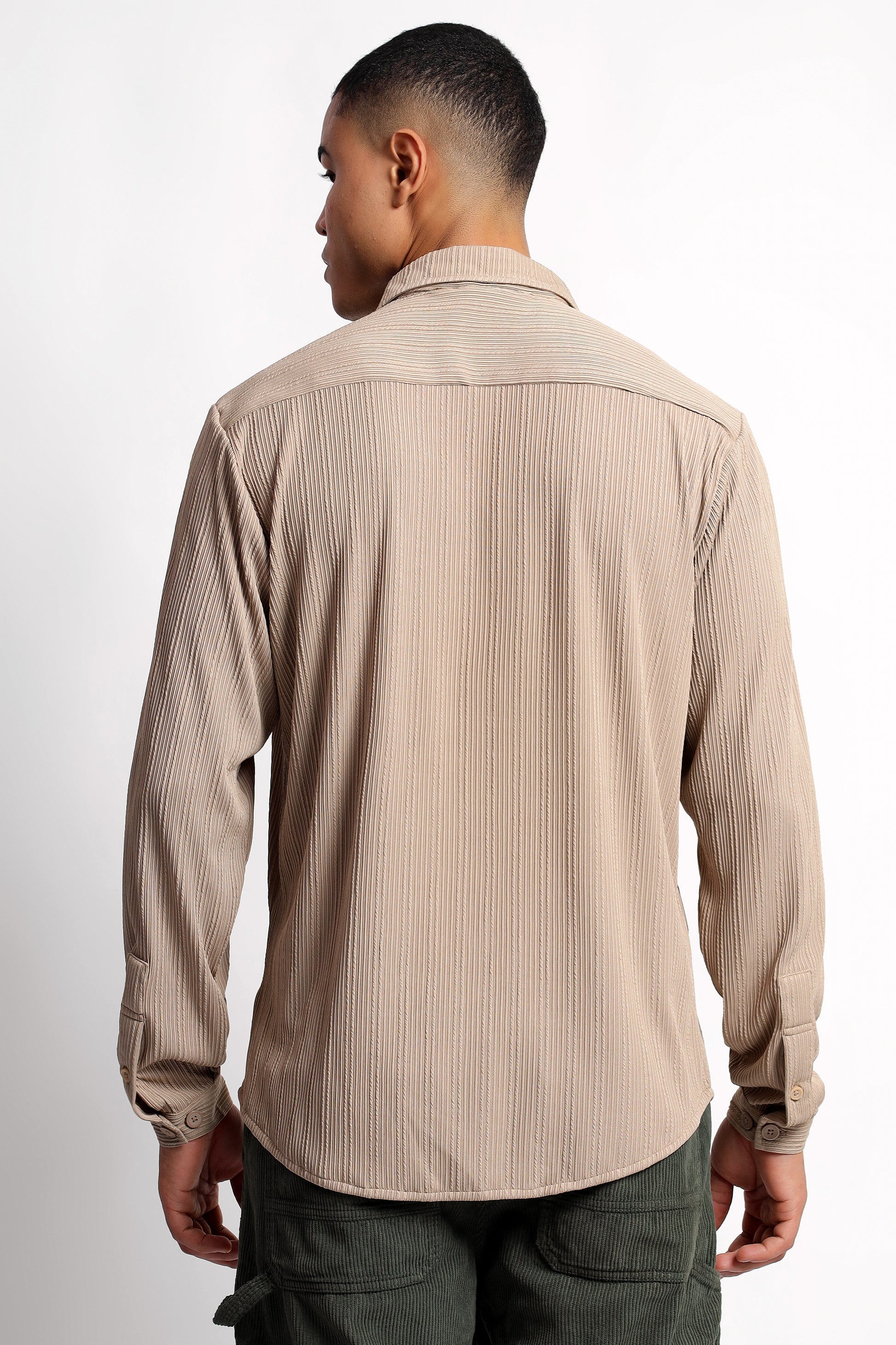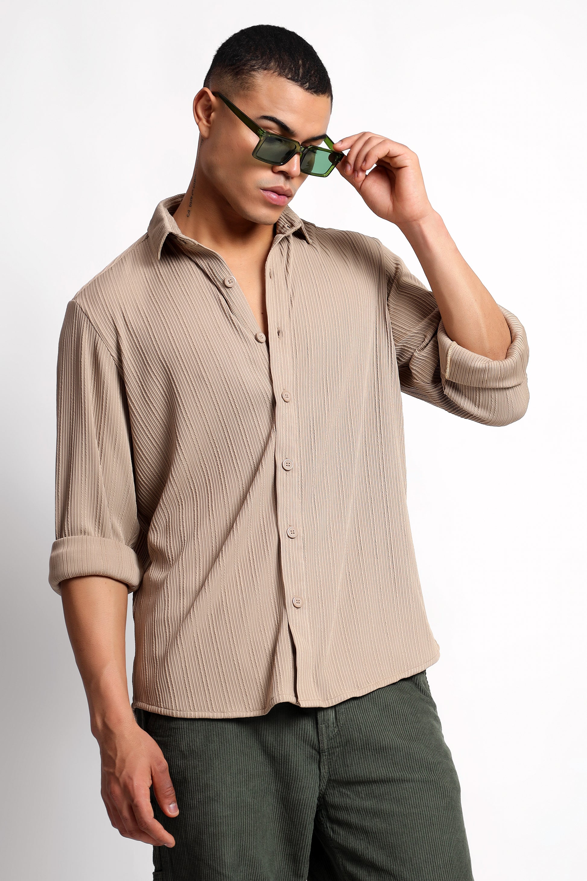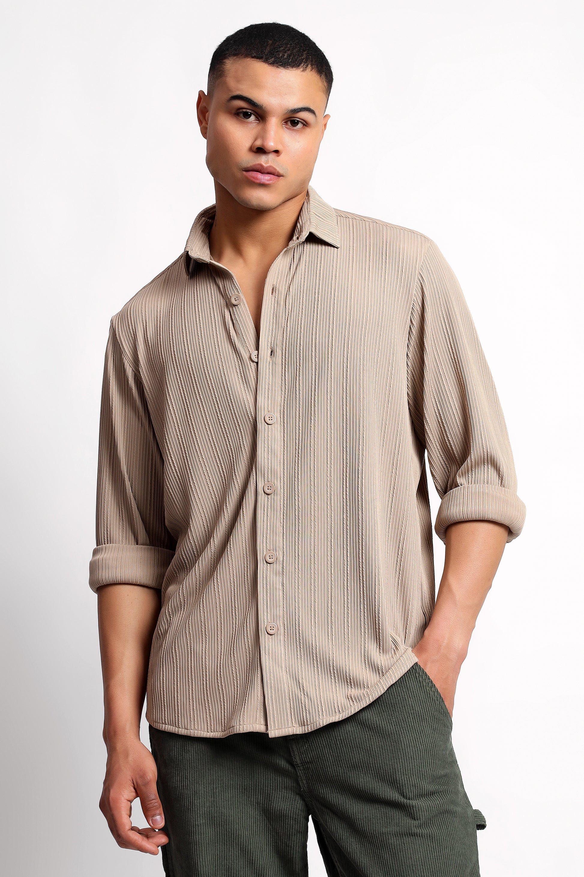 Elevate your look with the Mudih Men’s Textured Vertical Stripes Beige Shirt. Made from a premium polyester/lycra blend, this shirt features a classic spread collar, full sleeves with linked buttoned cuffs, and a curved hem for a modern, sleek style. Perfect for both formal and casual wear, the textured vertical stripes add a unique touch to any outfit.