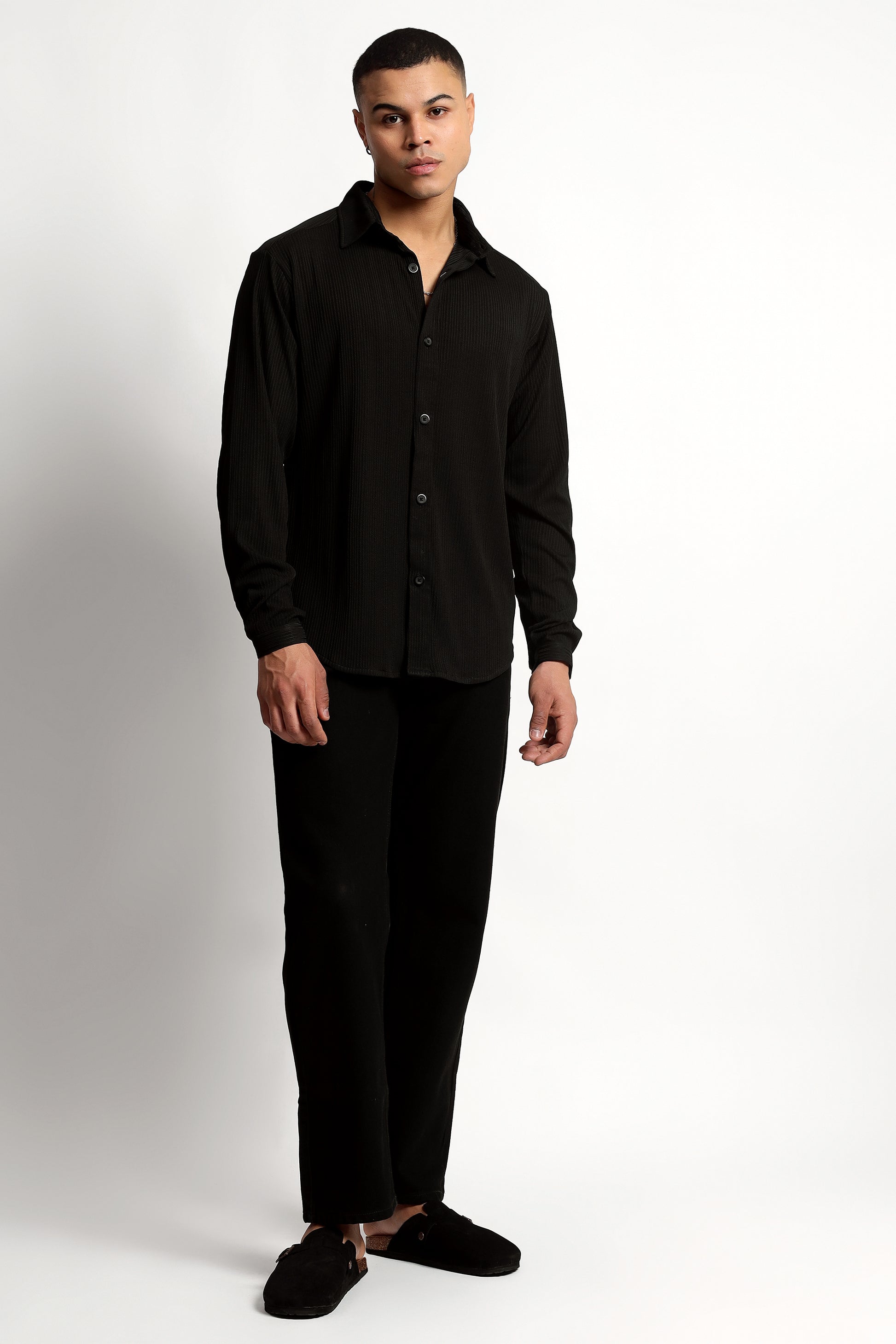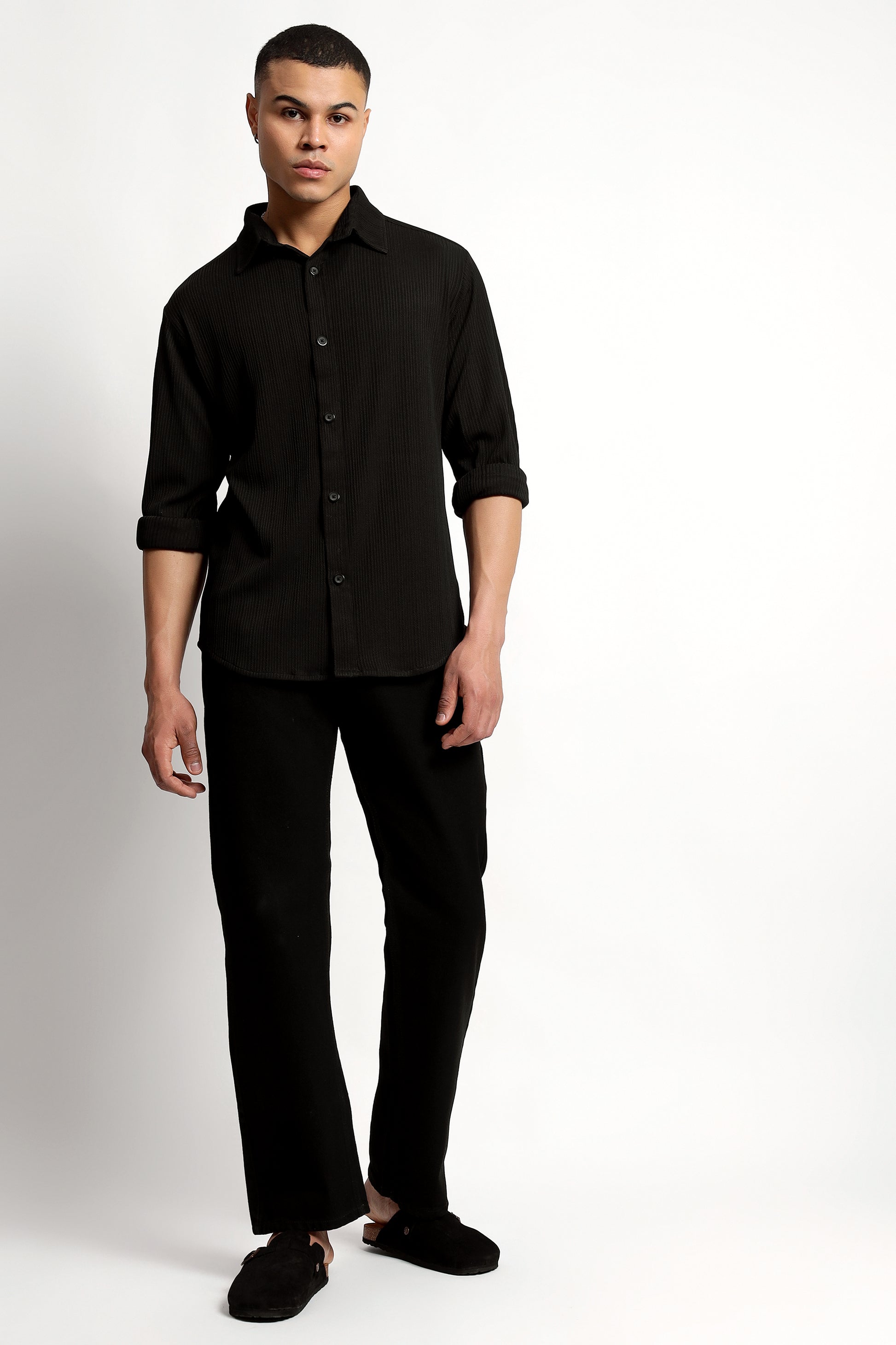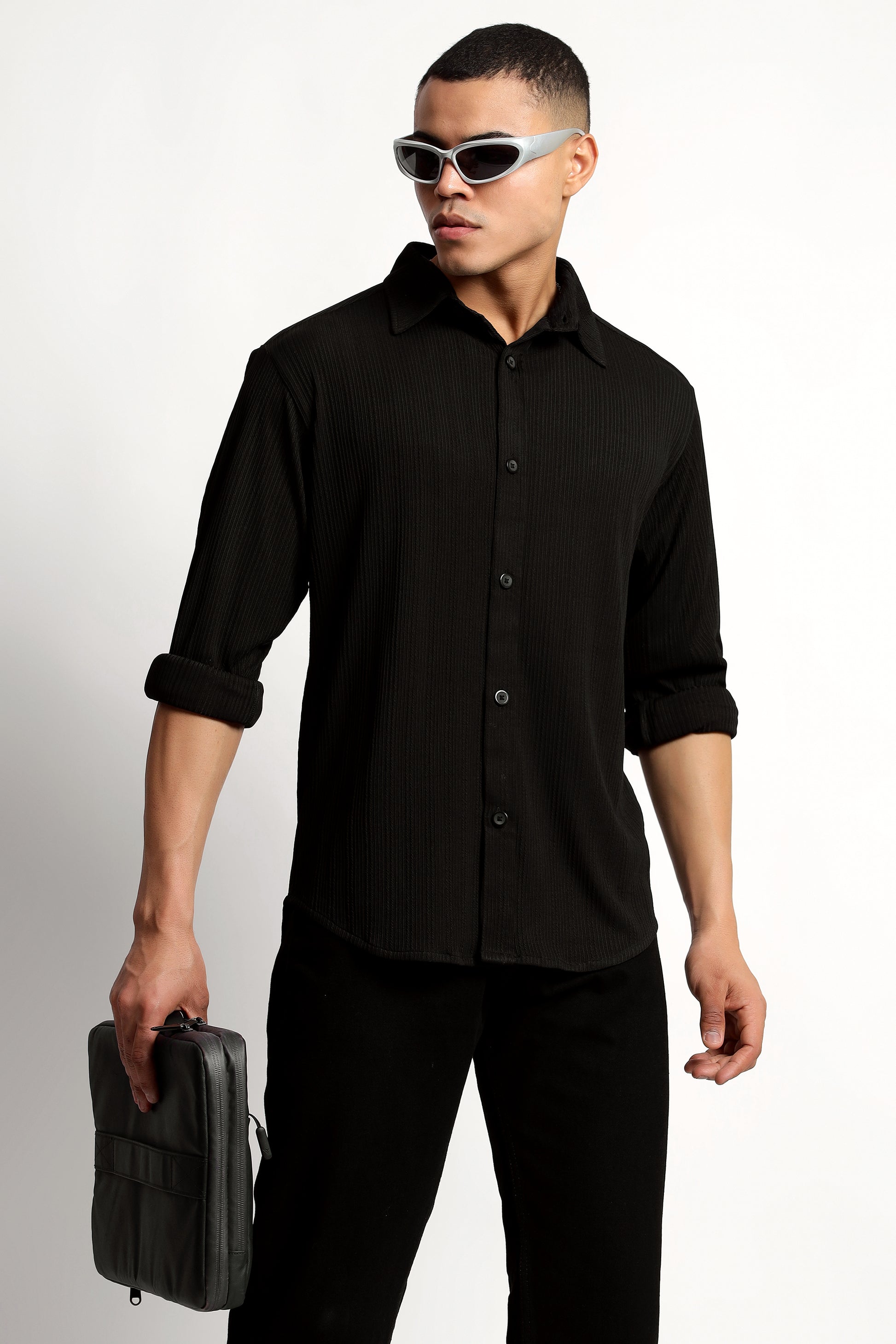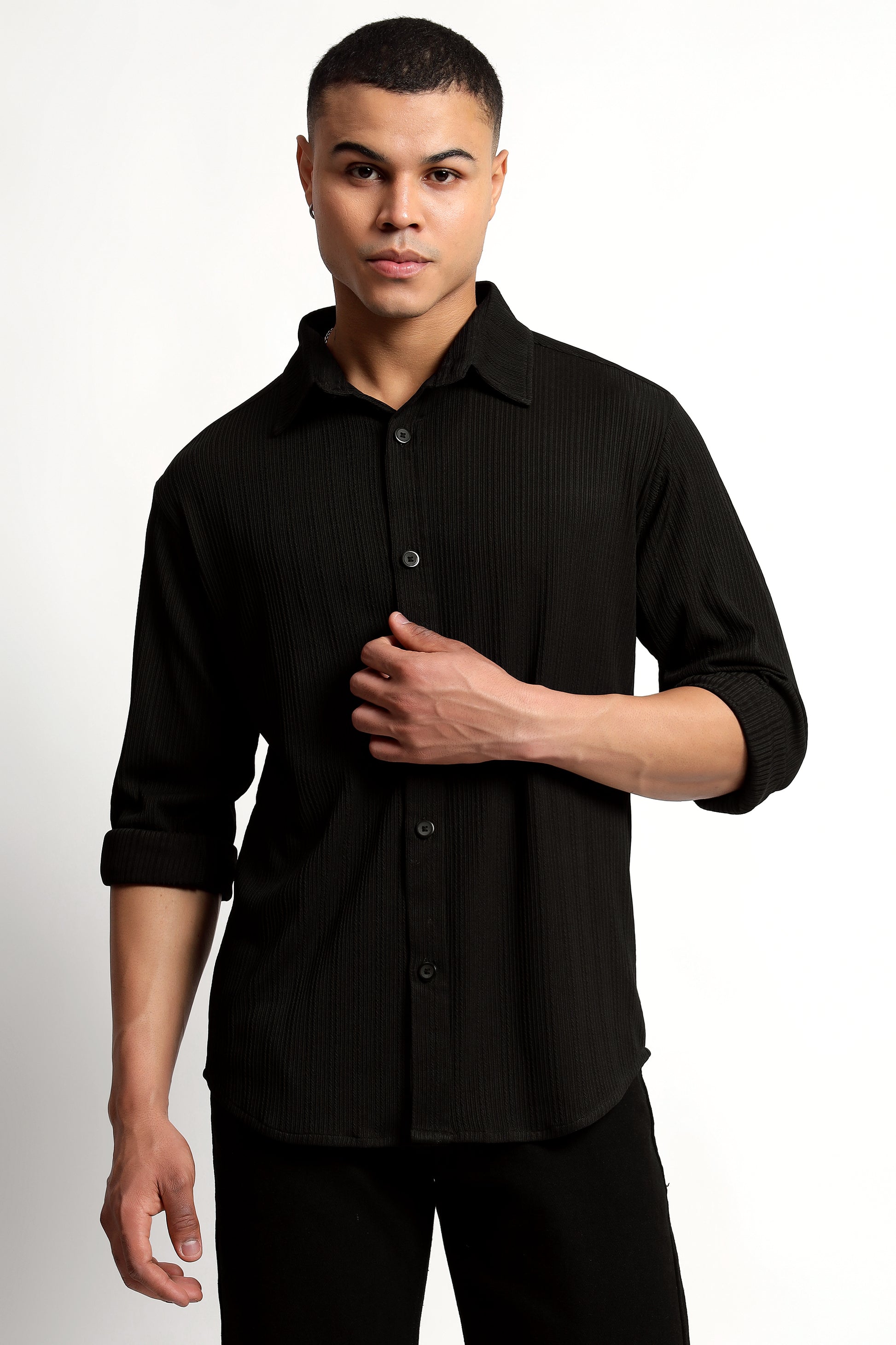 Elevate your look with the Mudih Men’s Textured Vertical Stripes Black Shirt. Made from a premium polyester/lycra blend, this shirt features a classic spread collar, full sleeves with linked buttoned cuffs, and a curved hem for a modern, sleek style. Perfect for both formal and casual wear, the textured vertical stripes add a unique touch to any outfit.