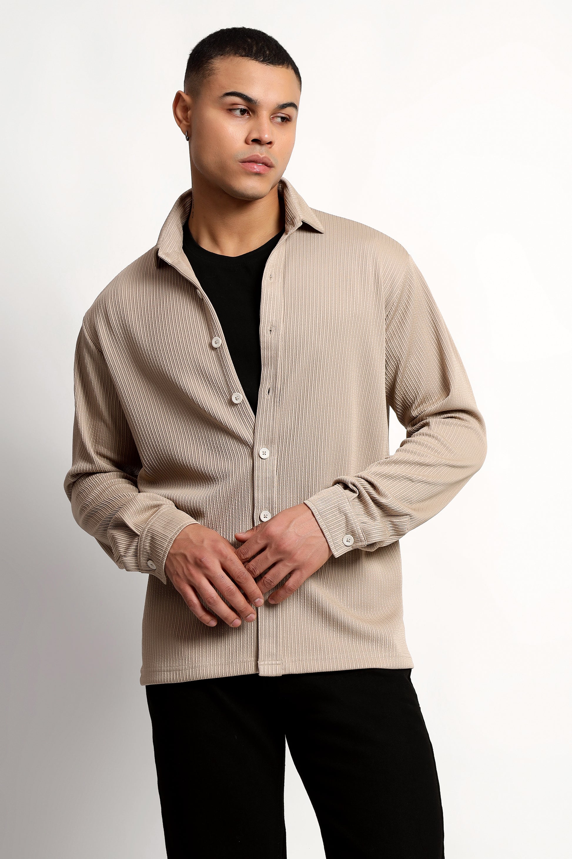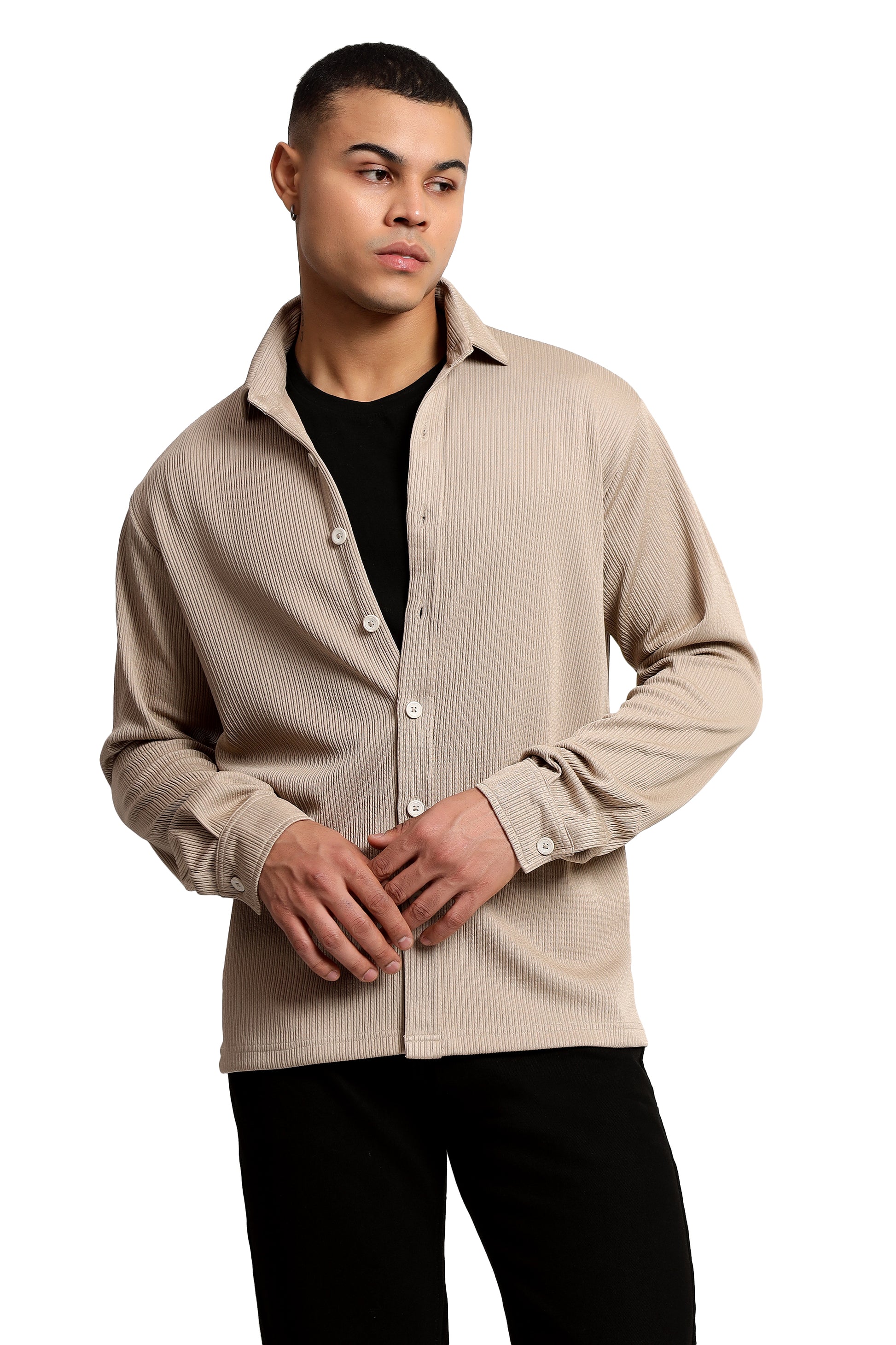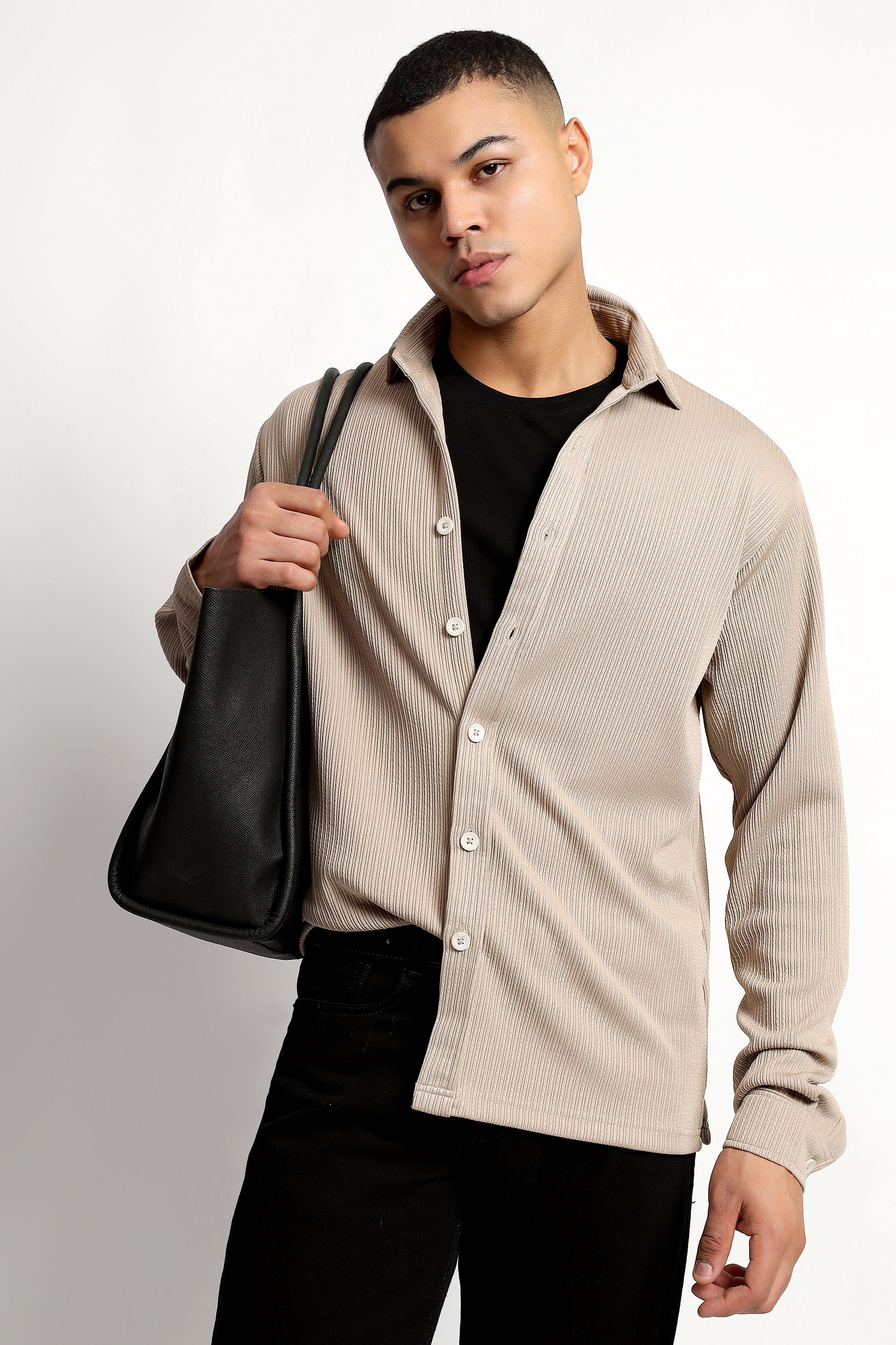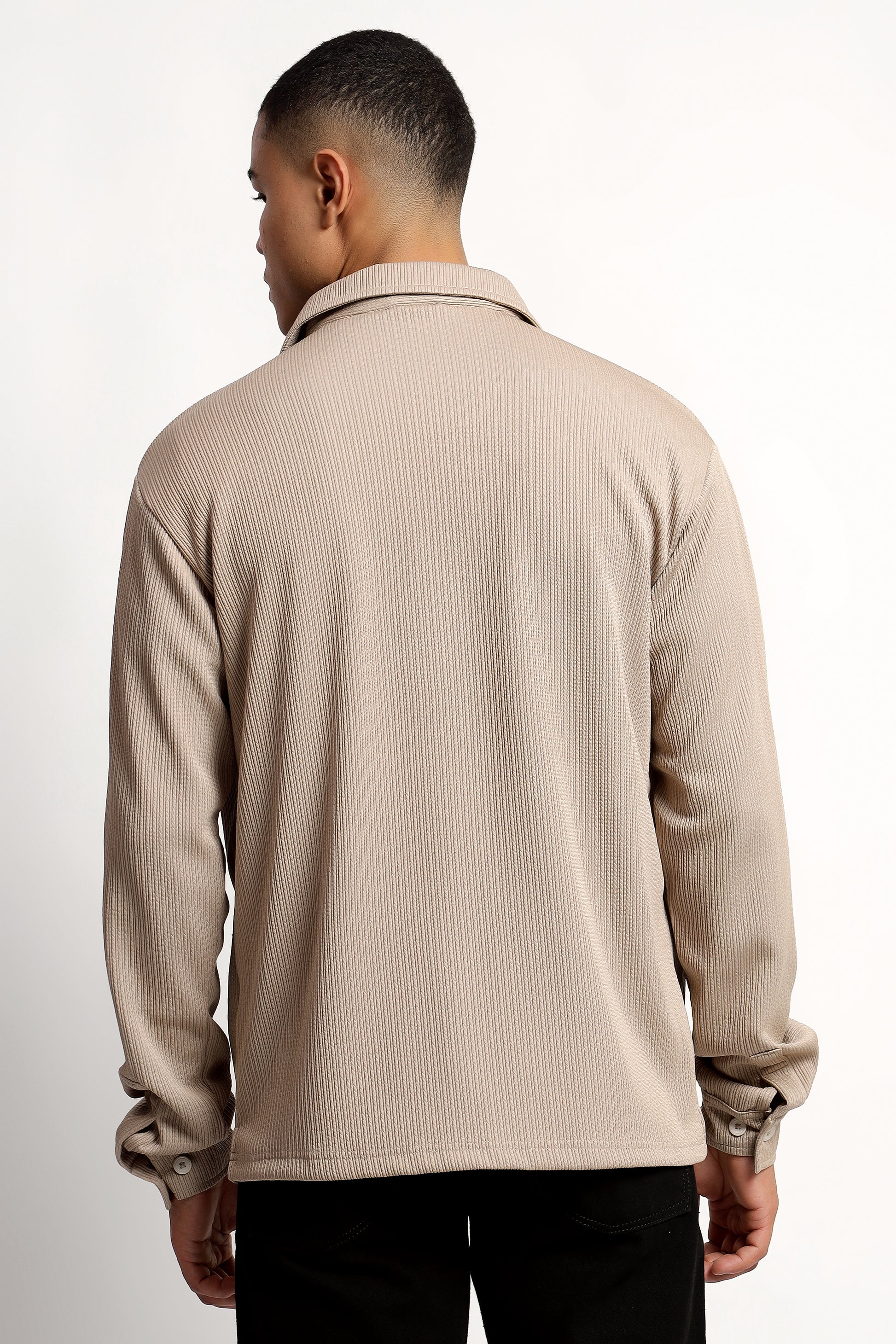 Upgrade your wardrobe with this Mudih Men's Regular Fit Beige Overshirt, made from a breathable cotton/polyester/elastane blend. Perfect for both summer & winter, this overshirt features a solid beige colour with subtle textured vertical stripes for a sleek, modern look. Ideal for casual and smart casual wear.