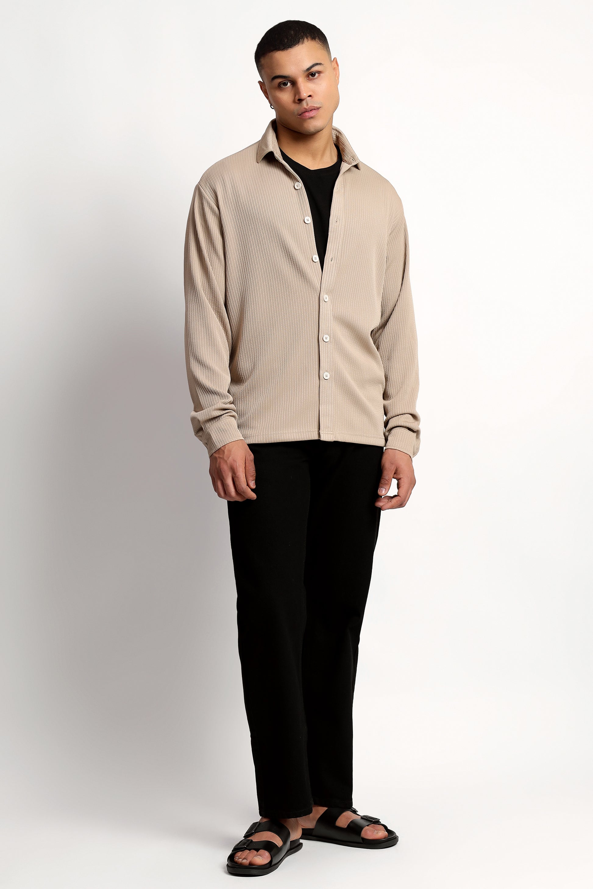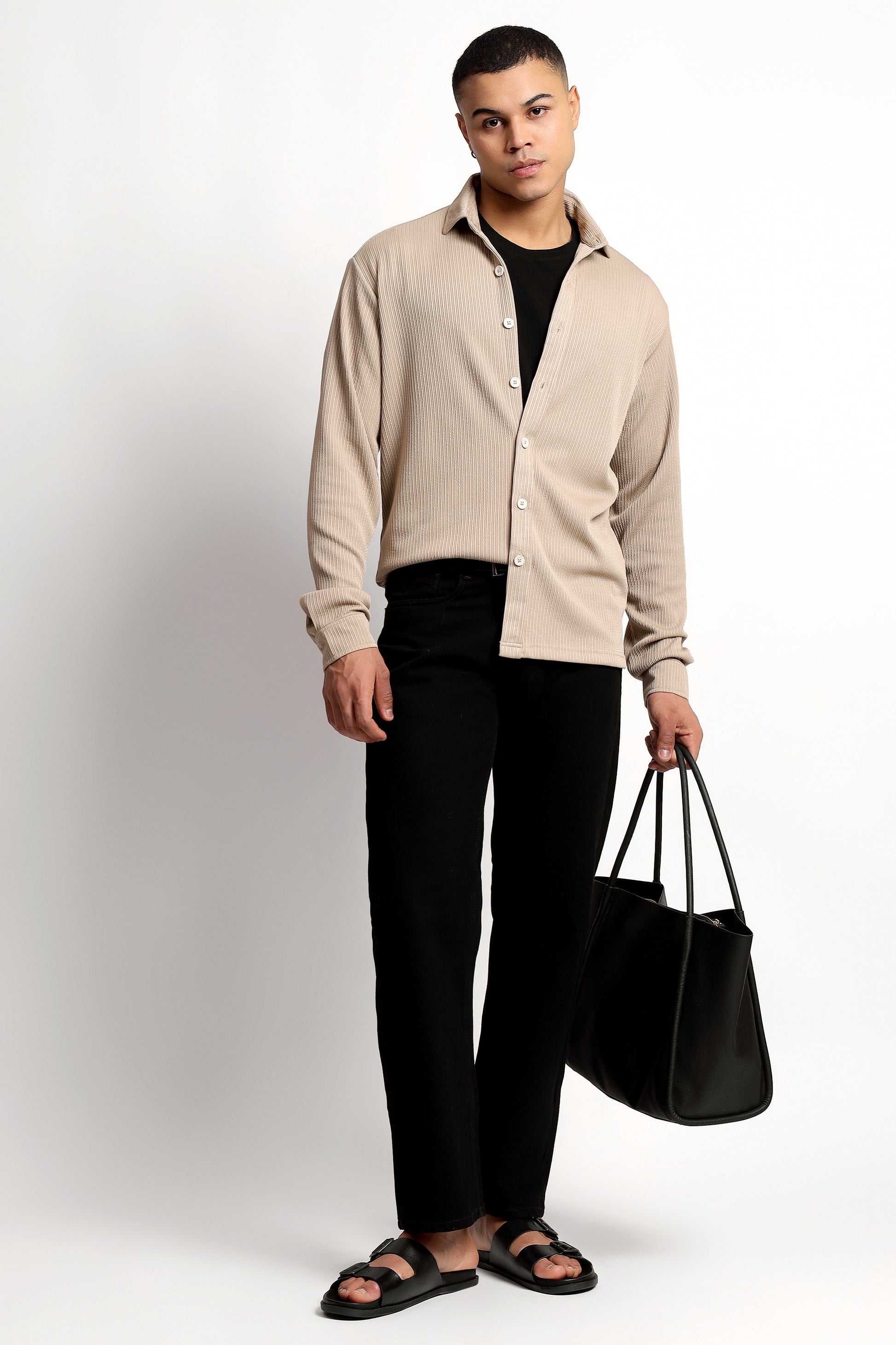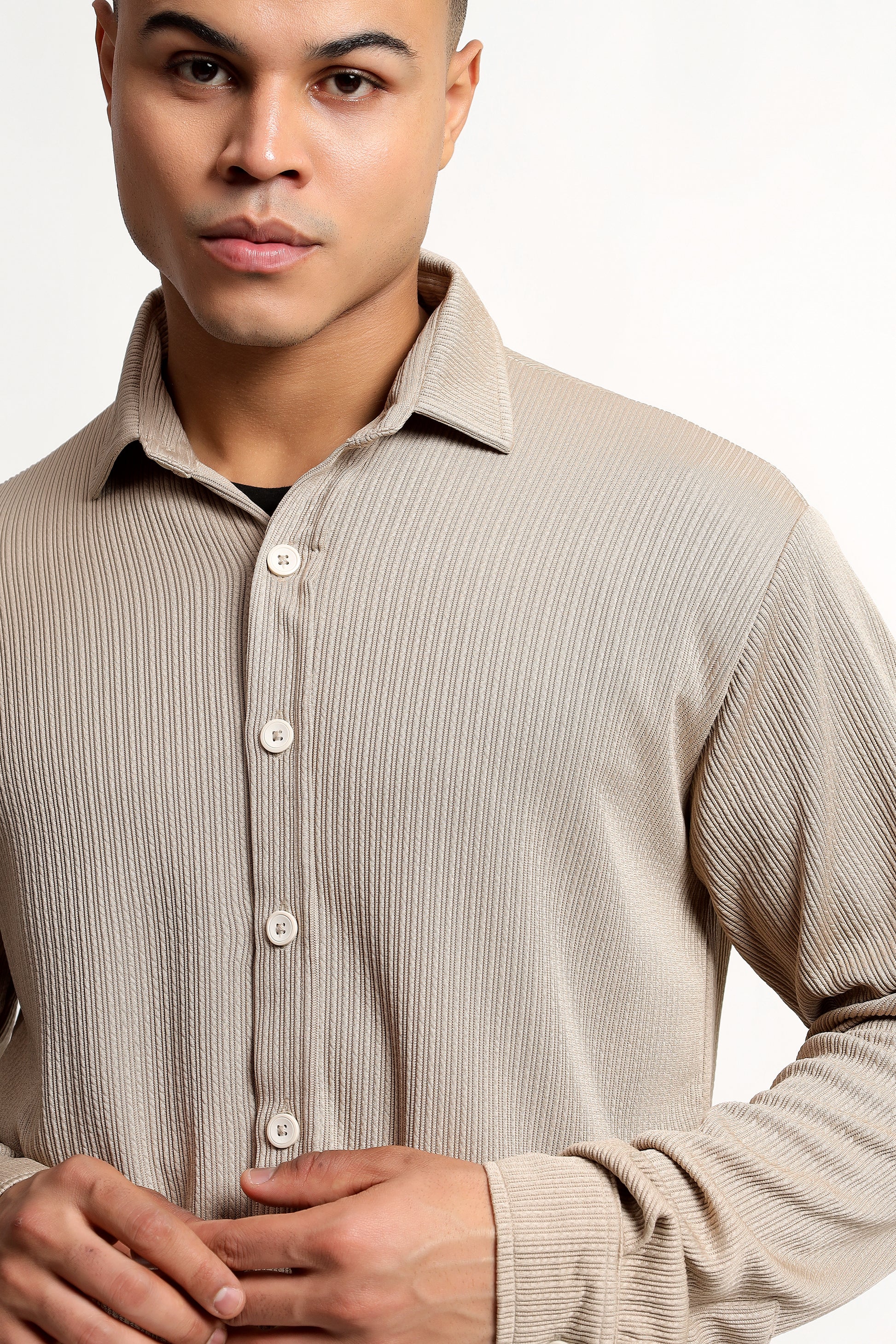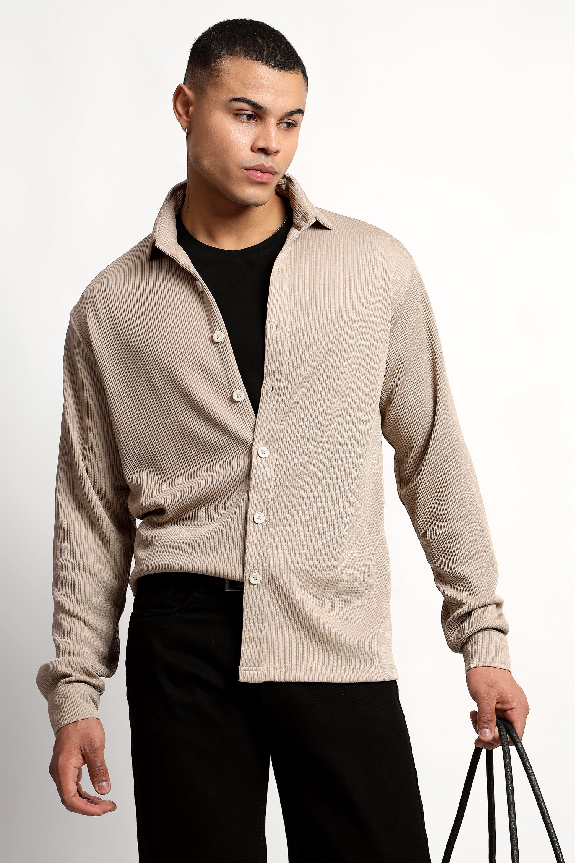 Upgrade your wardrobe with this Mudih Men's Regular Fit Beige Overshirt, made from a breathable cotton/polyester/elastane blend. Perfect for both summer & winter, this overshirt features a solid beige colour with subtle textured vertical stripes for a sleek, modern look. Ideal for casual and smart casual wear.