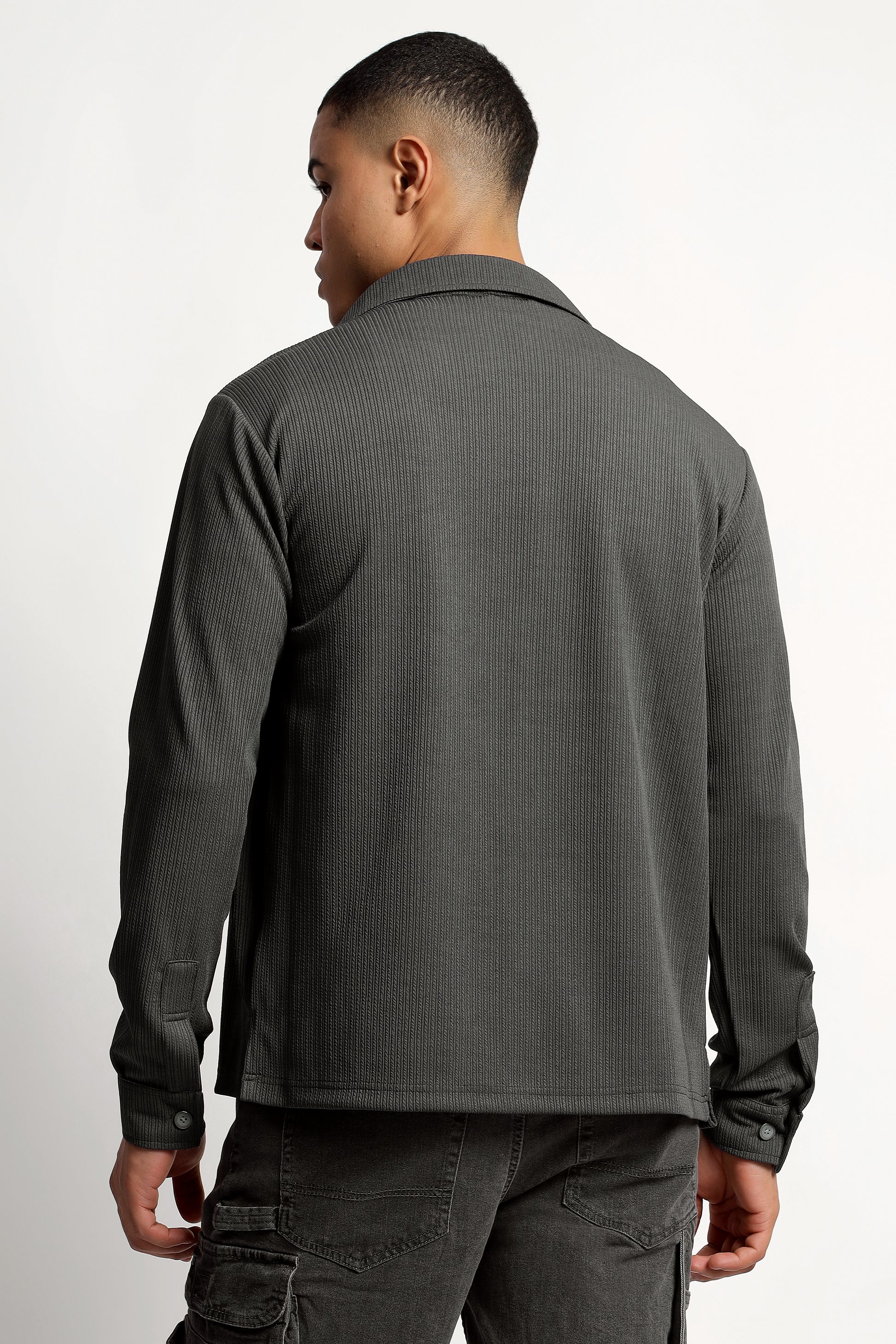 Upgrade your wardrobe with this Mudih Men's Regular Fit Grey Overshirt, made from a breathable cotton/polyester/elastane blend. Perfect for both summer & winter, this overshirt features a solid grey colour with subtle textured vertical stripes for a sleek, modern look. Ideal for casual and smart casual wear.