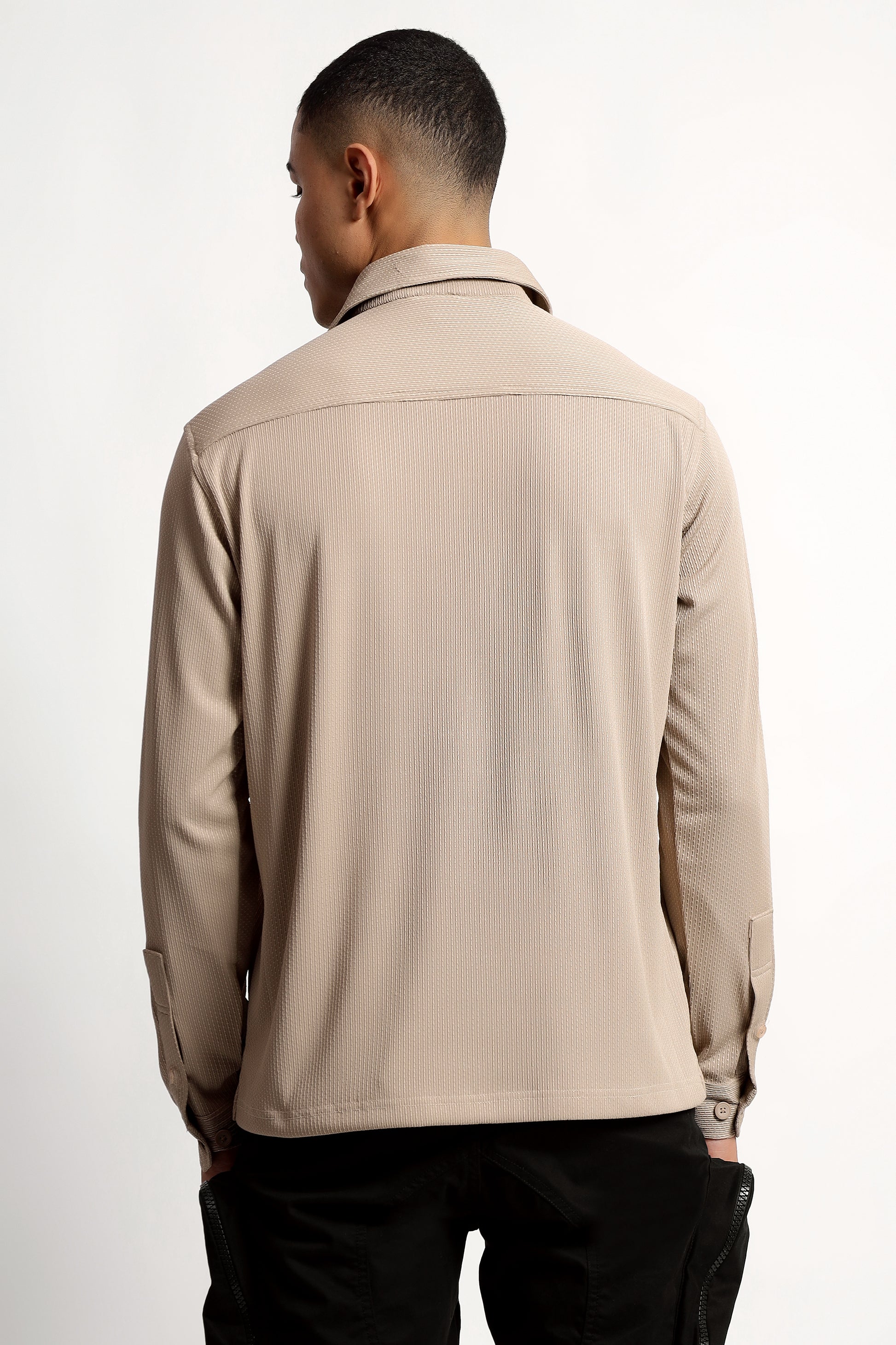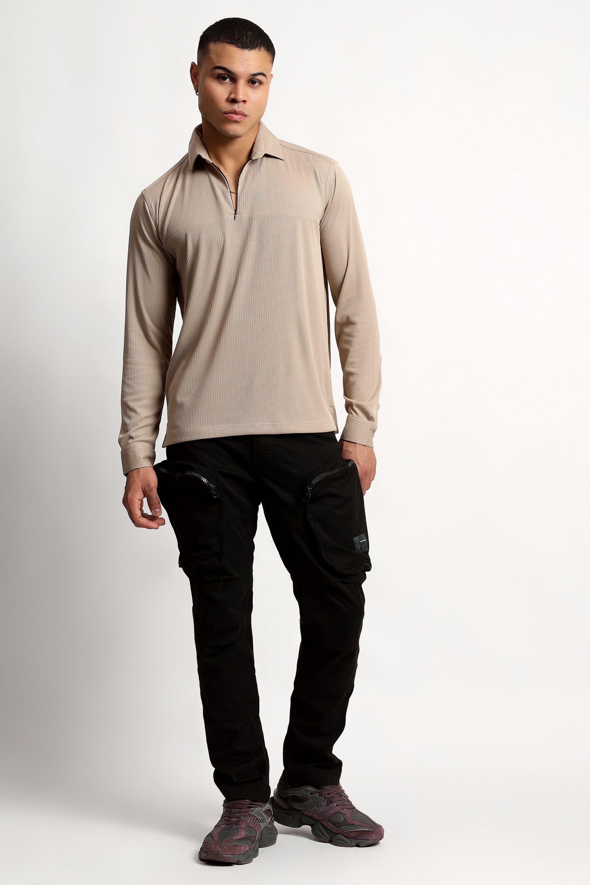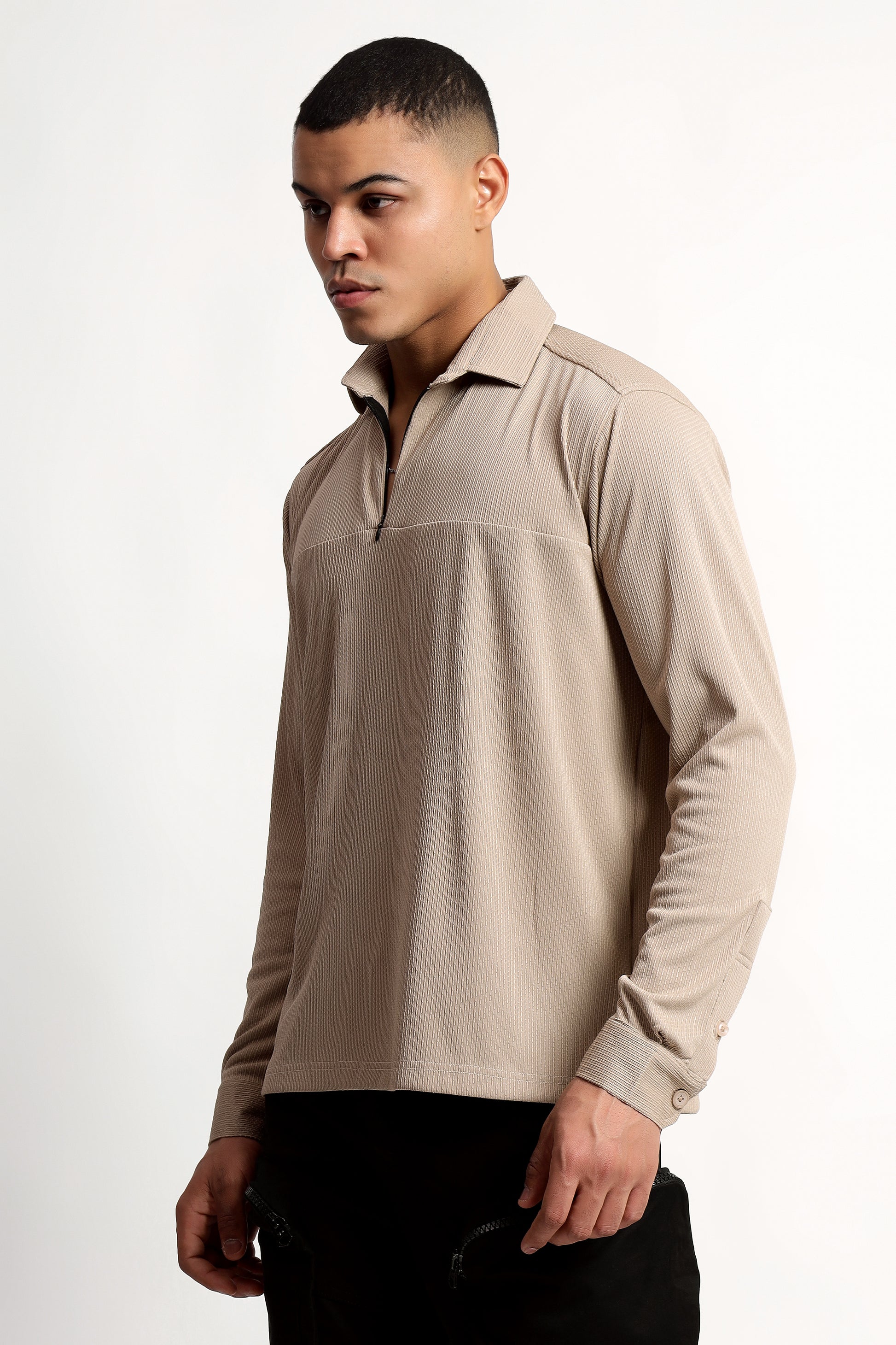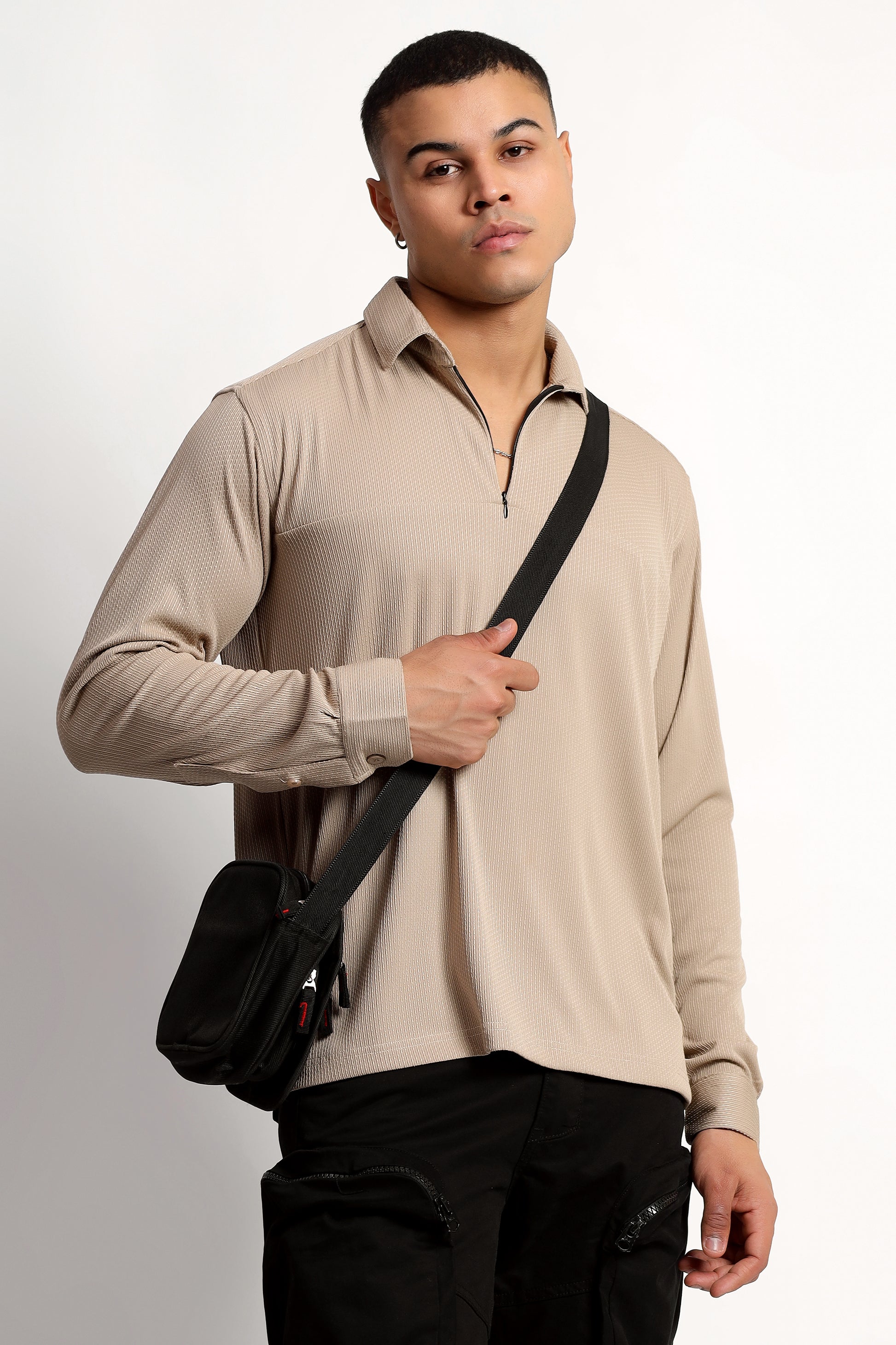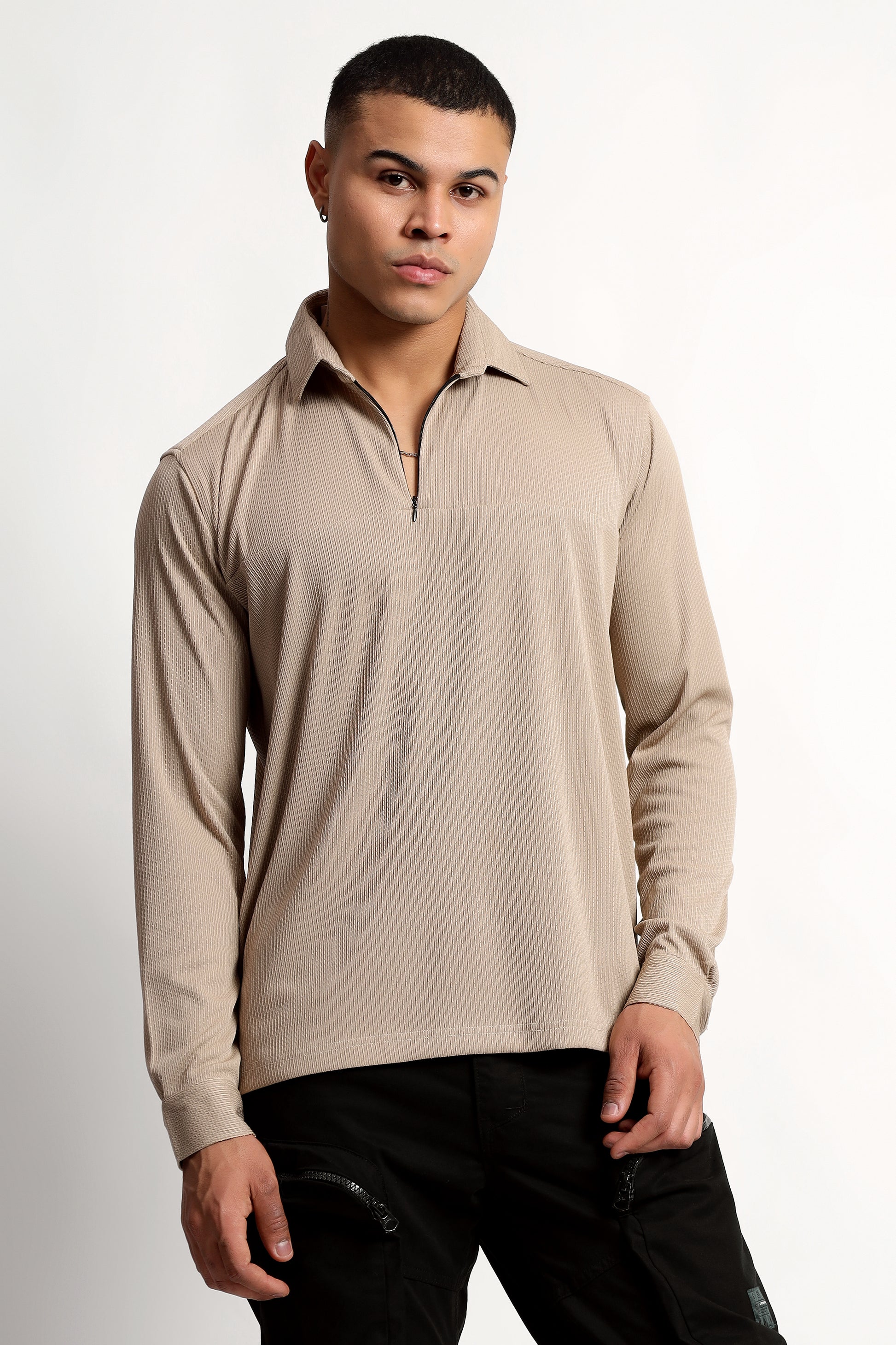 Elevate your wardrobe with our Regular Fit Half Zipper Beige Shirt for men, crafted from a high-quality polyester/lycra blend. This lightweight, breathable, and wrinkle-free shirt ensures all-day comfort while maintaining a sharp look. Featuring a half-zip design and full sleeves, it’s perfect for pairing with jeans, trousers, or shorts, offering versatility for any occasion.