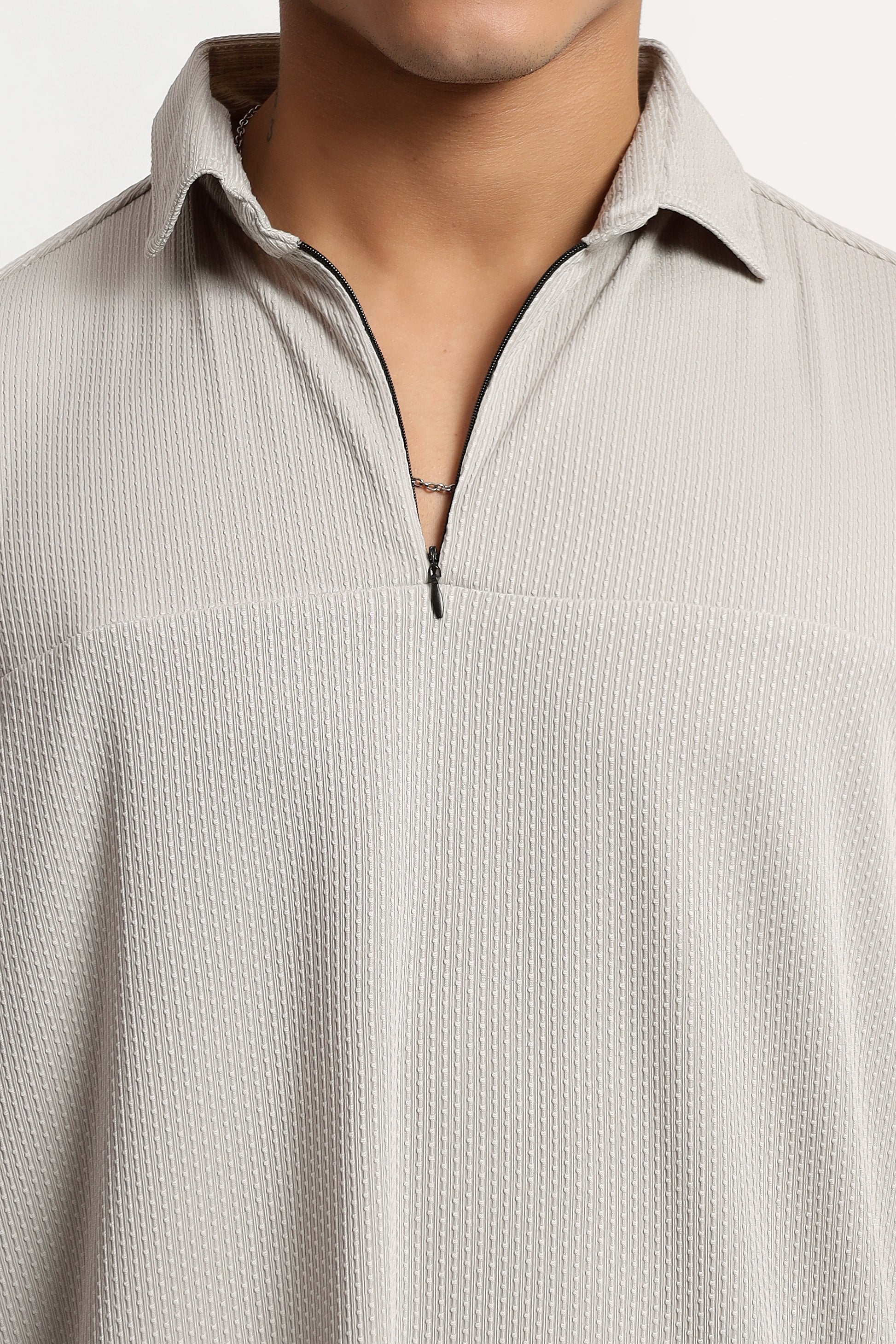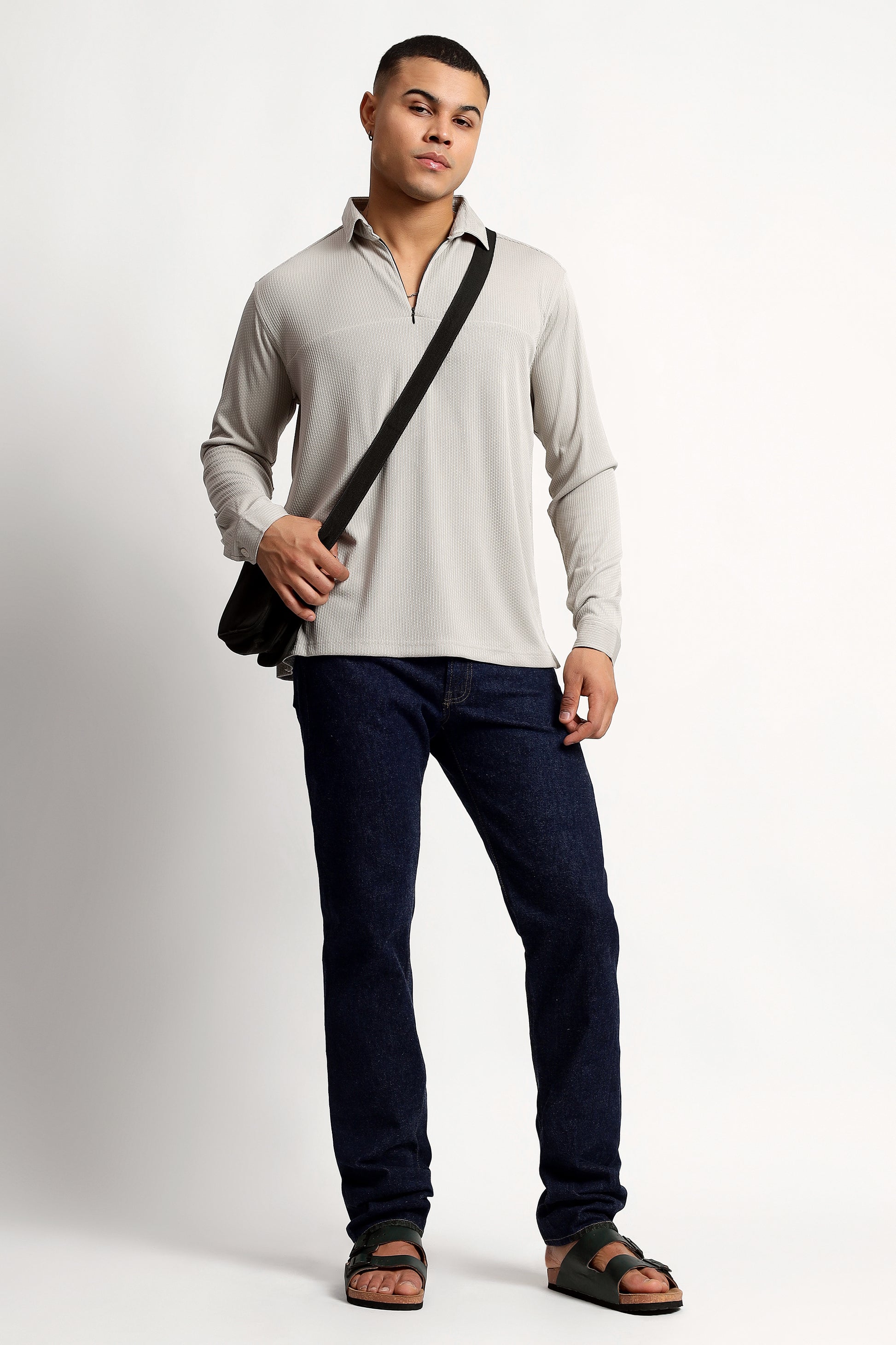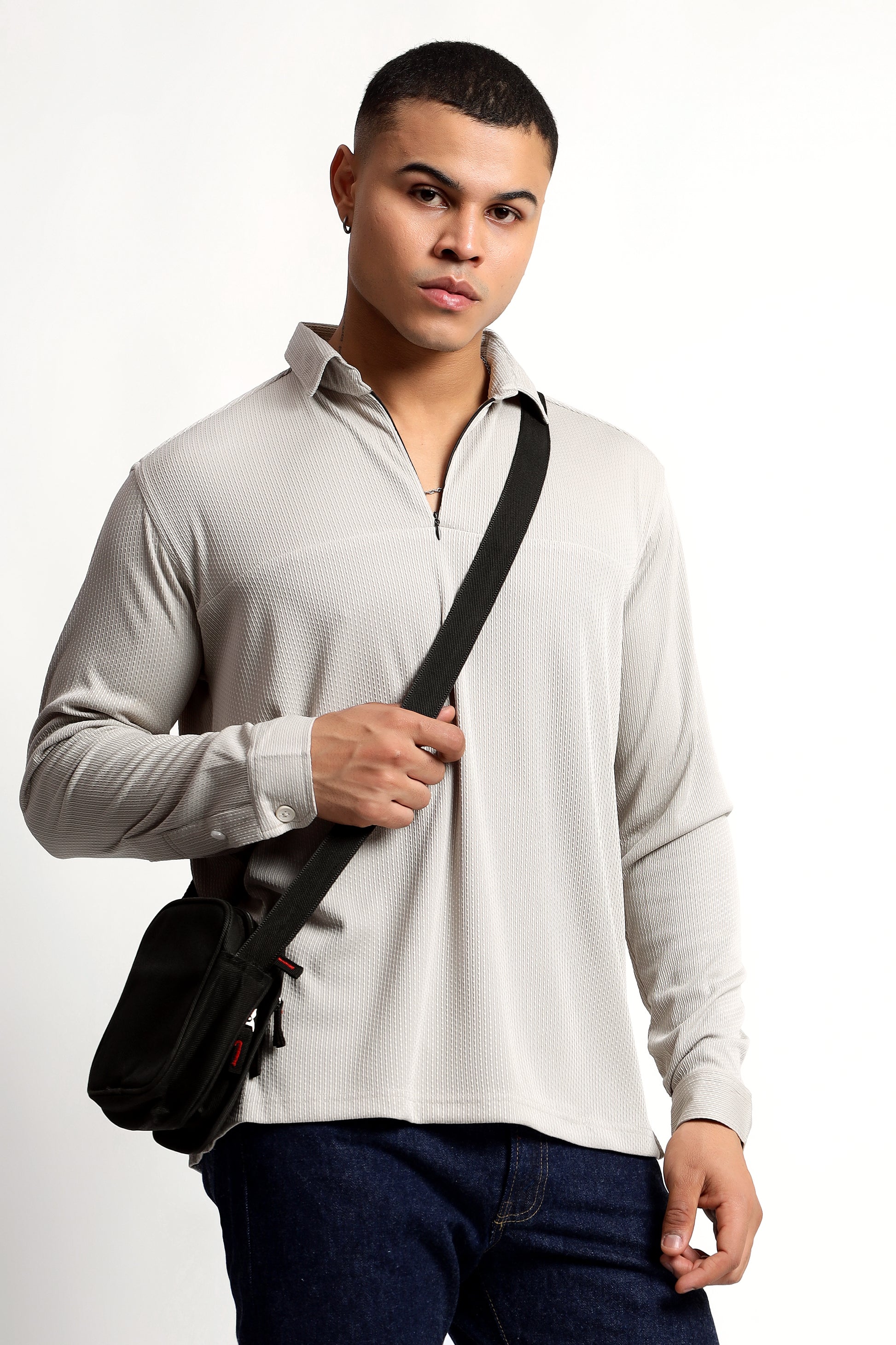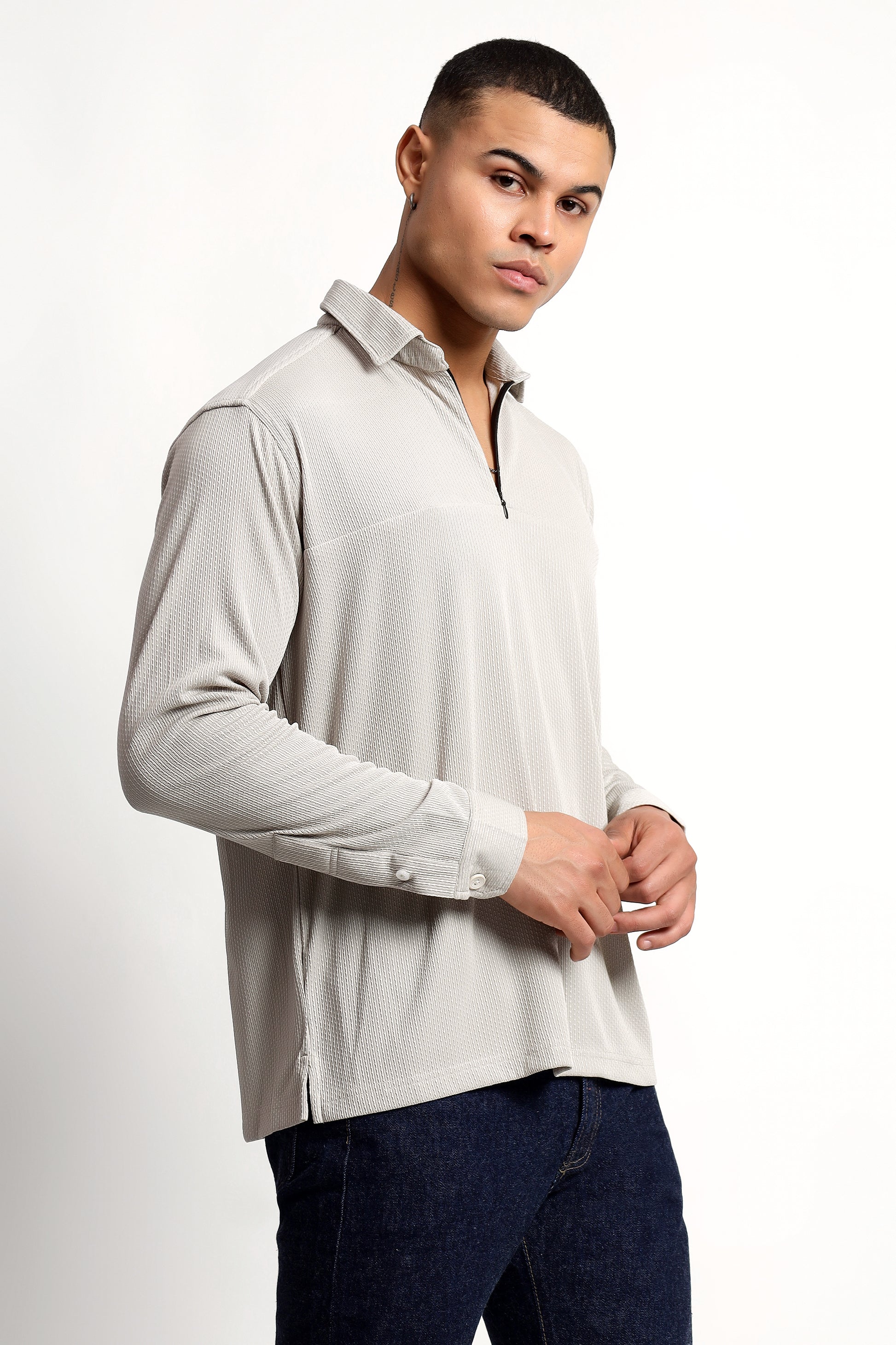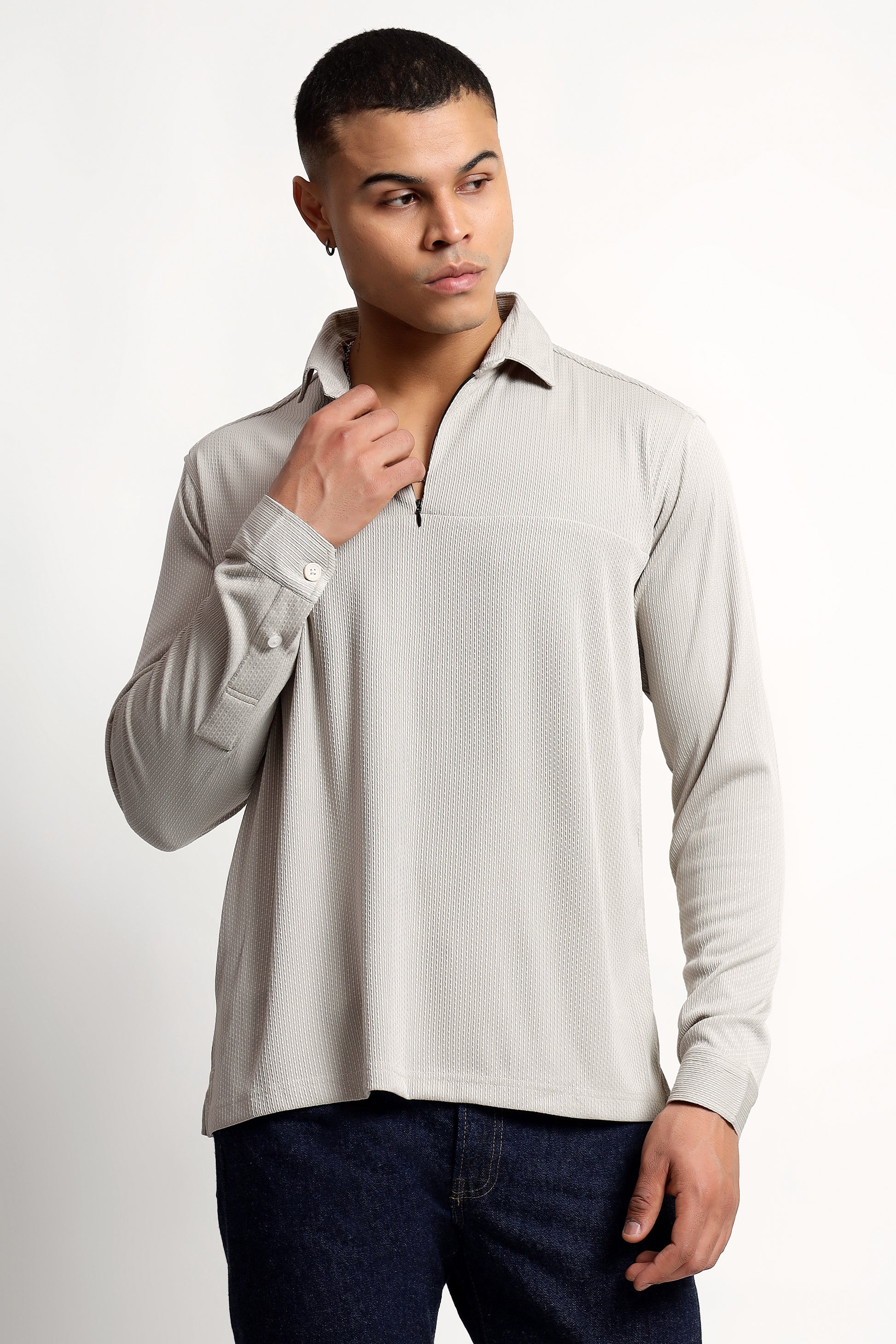 Elevate your wardrobe with our Regular Fit Half Zipper Light Grey Shirt for men, crafted from a high-quality polyester/lycra blend. This lightweight, breathable, and wrinkle-free shirt ensures all-day comfort while maintaining a sharp look. Featuring a half-zip design and full sleeves, it’s perfect for pairing with jeans, trousers, or shorts, offering versatility for any occasion.