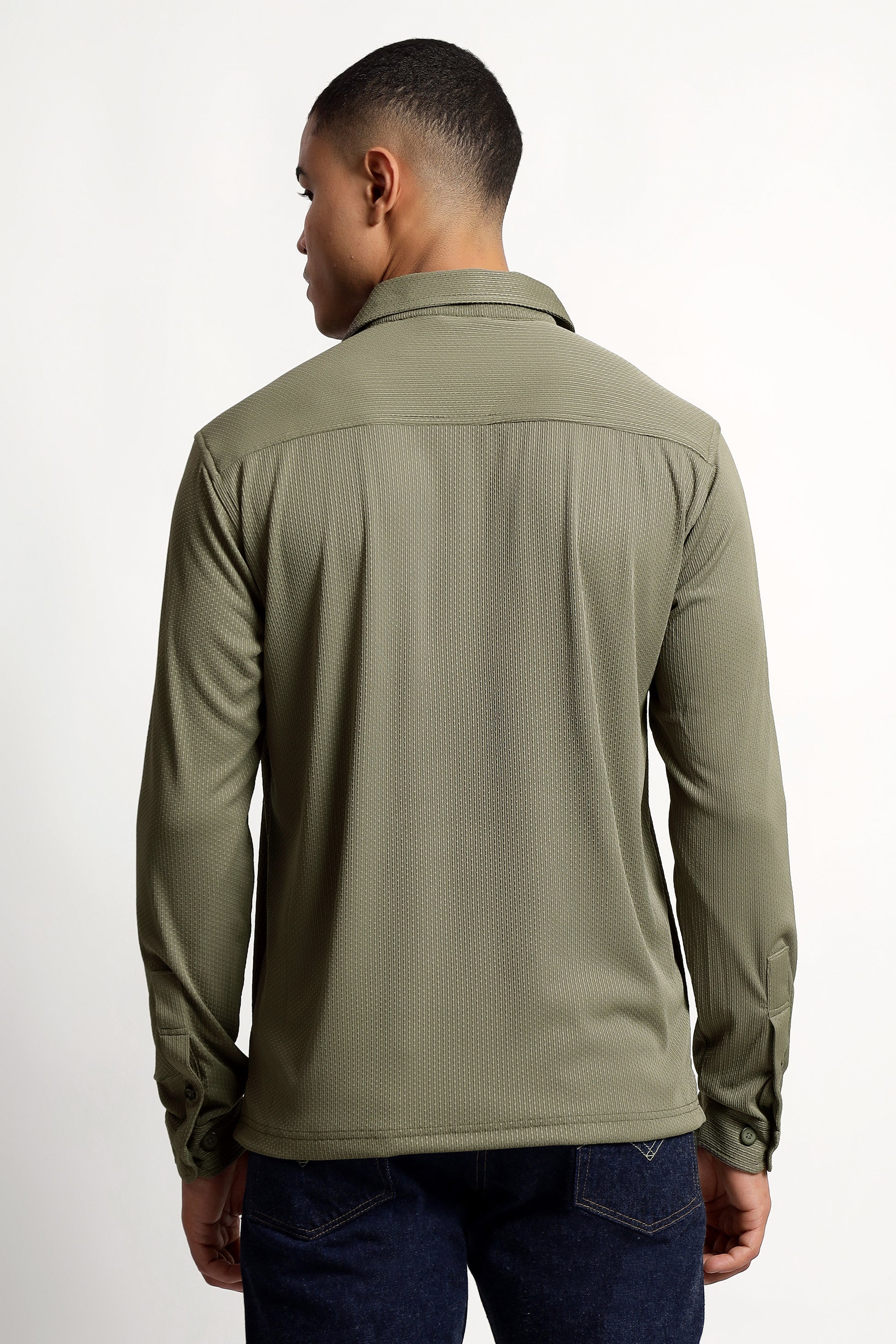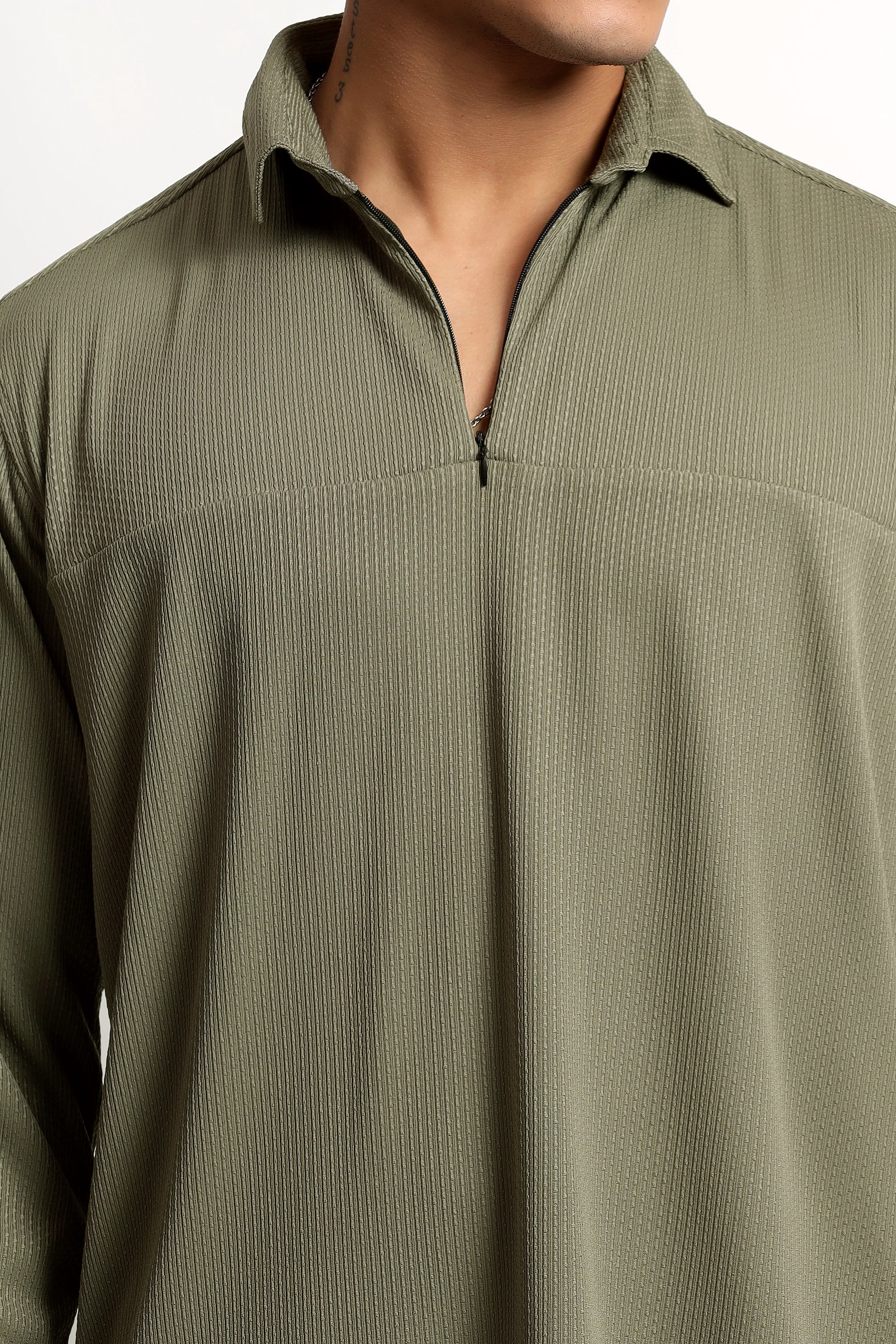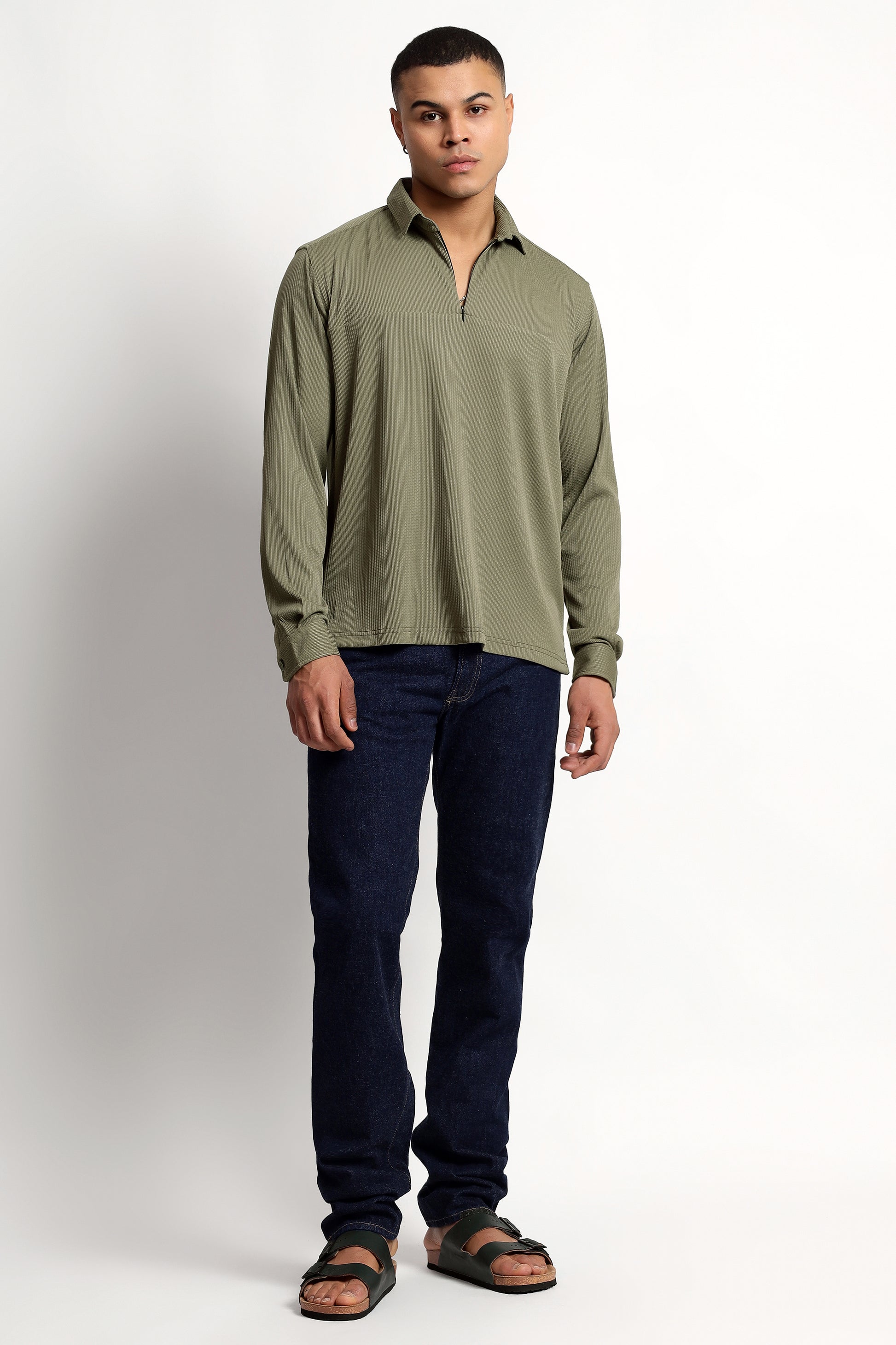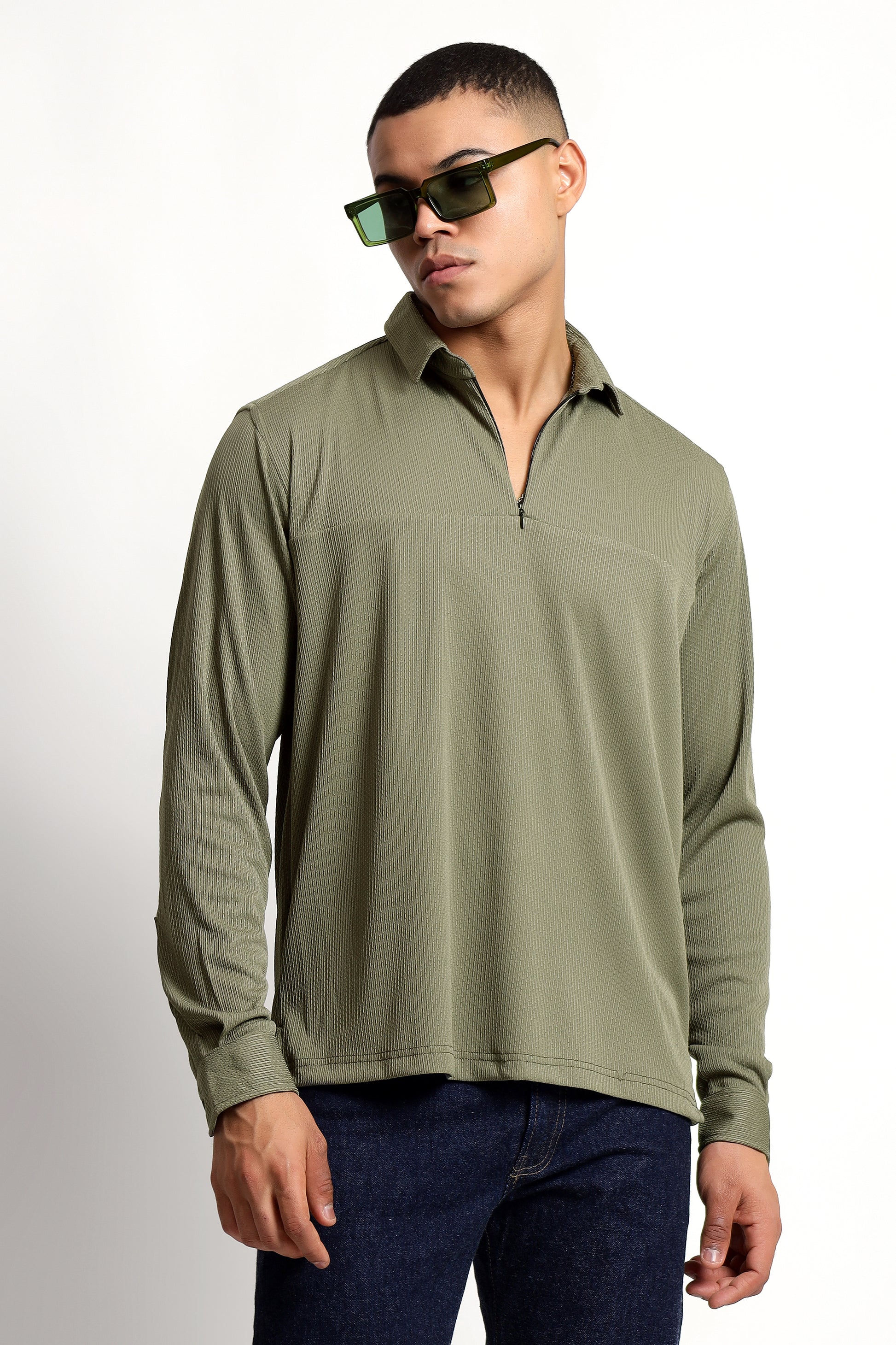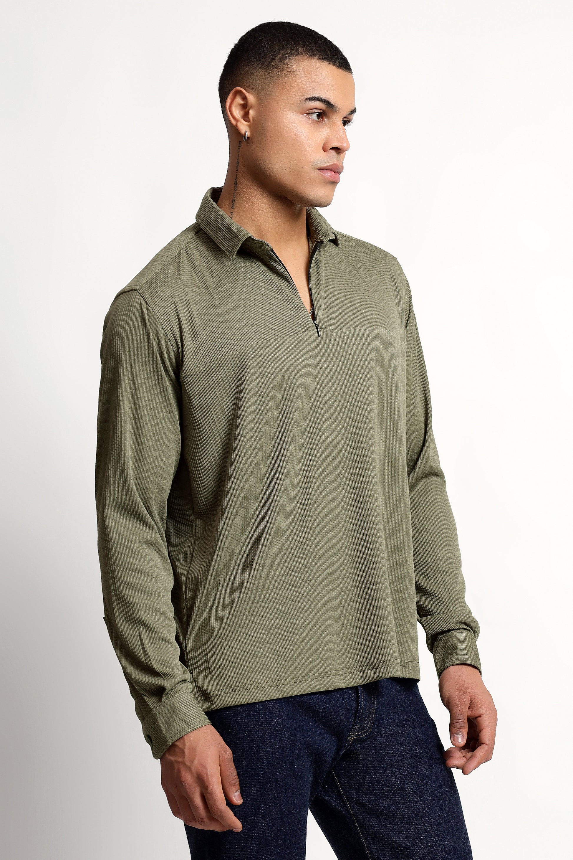 Regular Fit Half Zipper Olive Green Shirt