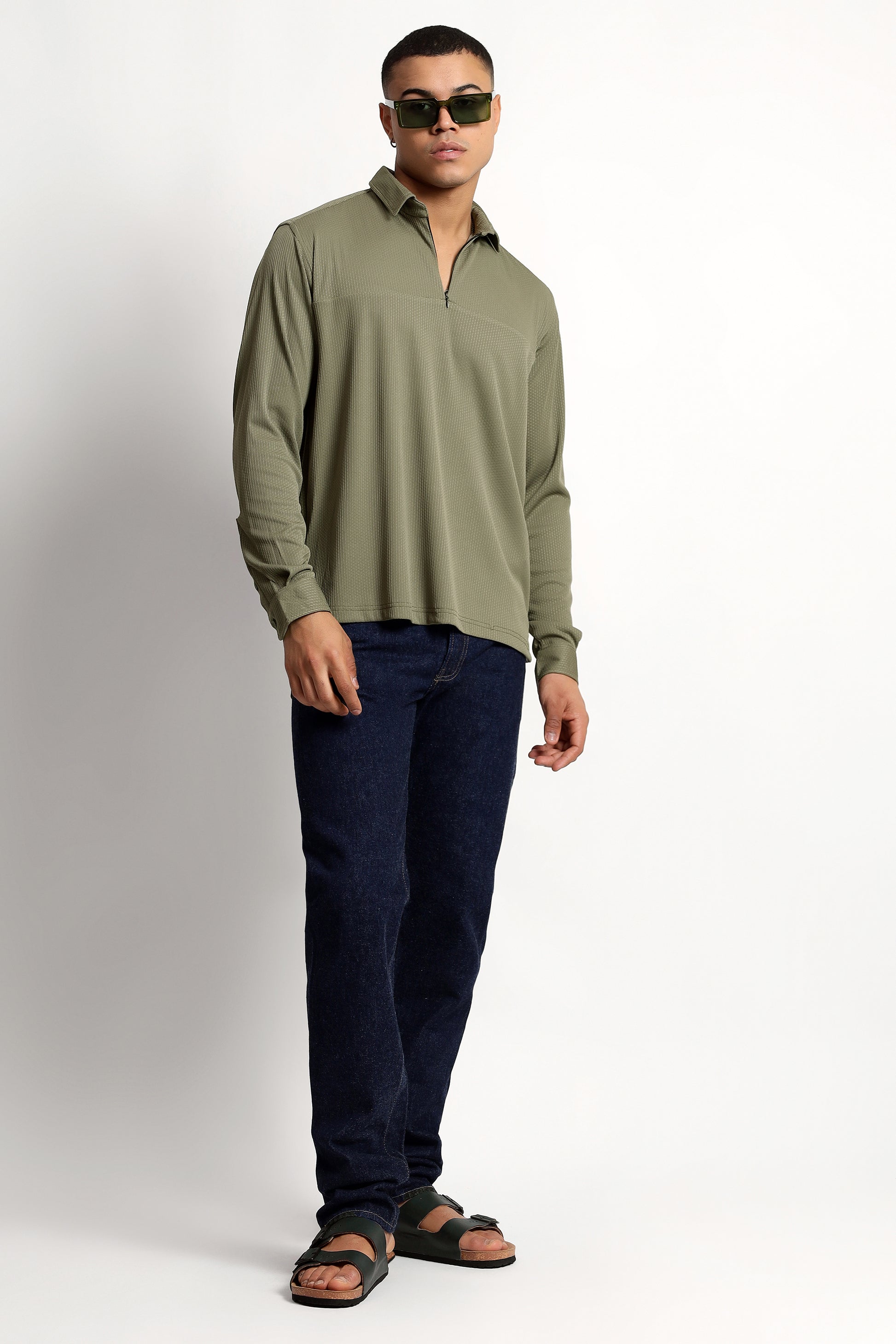 Elevate your wardrobe with our Regular Fit Half Zipper Olive Green Shirt for men, crafted from a high-quality polyester/lycra blend. This lightweight, breathable, and wrinkle-free shirt ensures all-day comfort while maintaining a sharp look. Featuring a half-zip design and full sleeves, it’s perfect for pairing with jeans, trousers, or shorts, offering versatility for any occasion. Whether you’re dressing up or keeping it casual, this stylish shirt delivers comfort and confidence in every season.