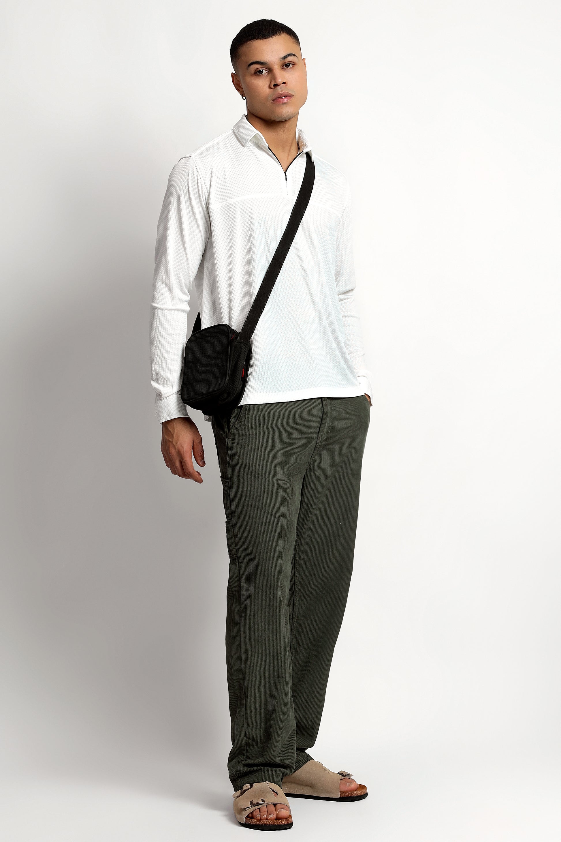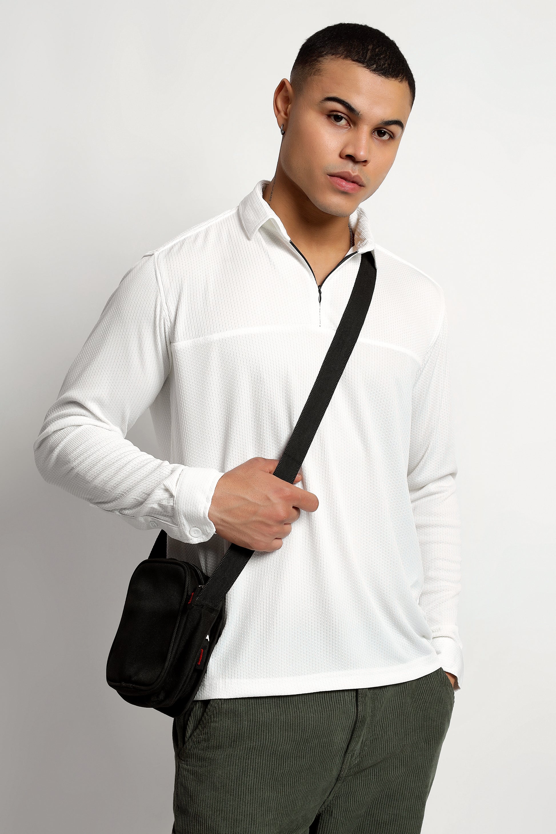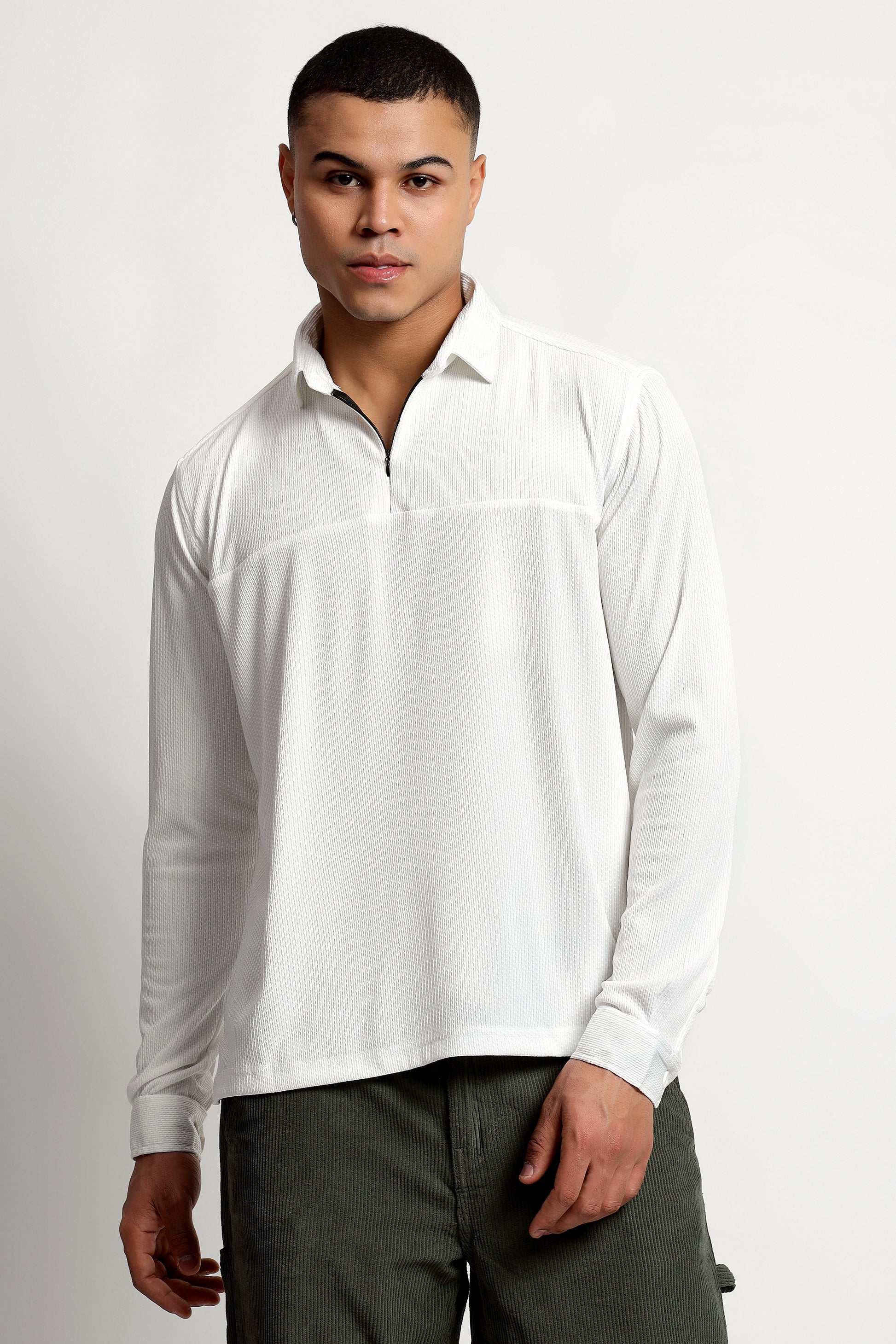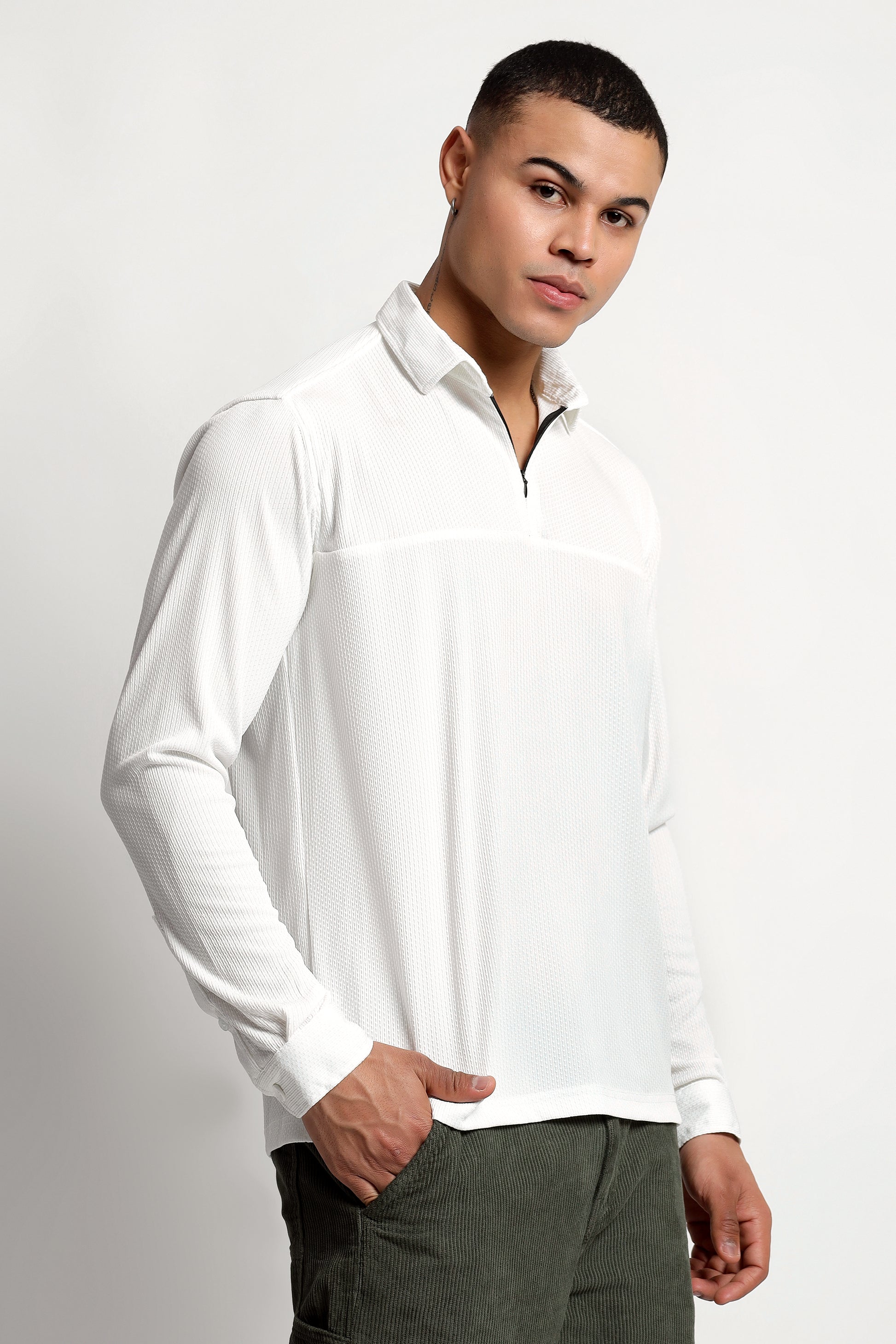 Elevate your wardrobe with our Regular Fit Half Zipper White Shirt for men, crafted from a high-quality polyester/lycra blend. This lightweight, breathable, and wrinkle-free shirt ensures all-day comfort while maintaining a sharp look. Featuring a half-zip design and full sleeves, it’s perfect for pairing with jeans, trousers, or shorts, offering versatility for any occasion. Whether you’re dressing up or keeping it casual, this stylish shirt delivers comfort and confidence in every season.