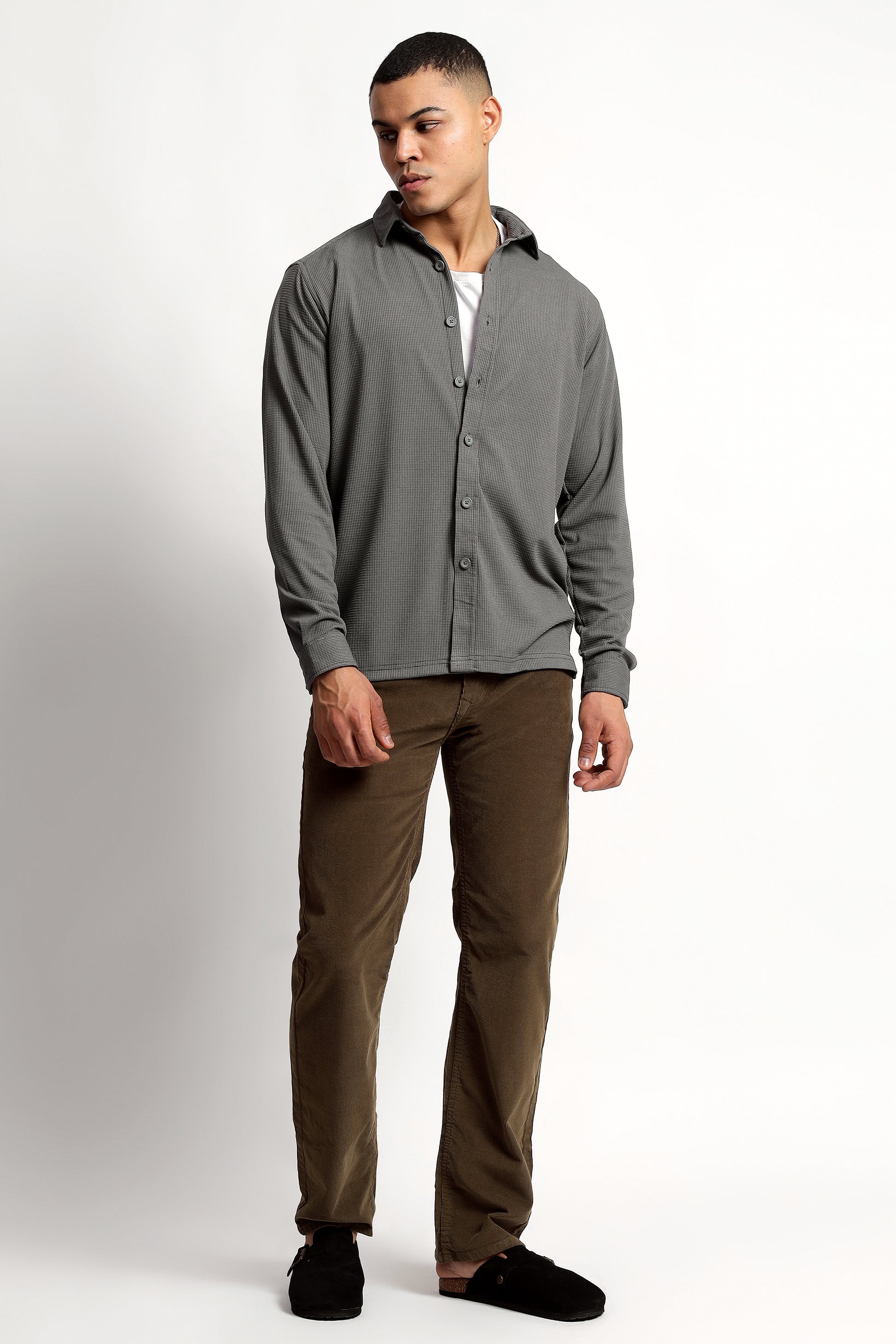 Step up your style game with the Mudih Men’s Regular Fit Grey Shirt, crafted from a soft and durable polyester/cotton blend. This versatile shirt features a classic full button placket on the front, full sleeves with linked buttoned cuffs, and a sleek flat hem for a polished look. Ideal for both casual and formal occasions, the rich brown color adds a modern touch to any outfit.